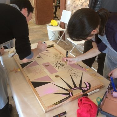 En équipe, les participants ont réalisé une composition collective en laissant libre cours à leur imagination. On a mis à leur disposition de la peinture, des rouleaux, des tampons… pour un moment de lâcher-prise et de créativité. Après assemblage, il restait un temps individuel permettant de personnaliser sa future lampe grâce à des motifs graphiques.