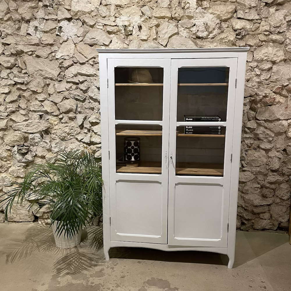 Une armoire provençale, composées de 2 portes vitrées et 4 étagères en pin.