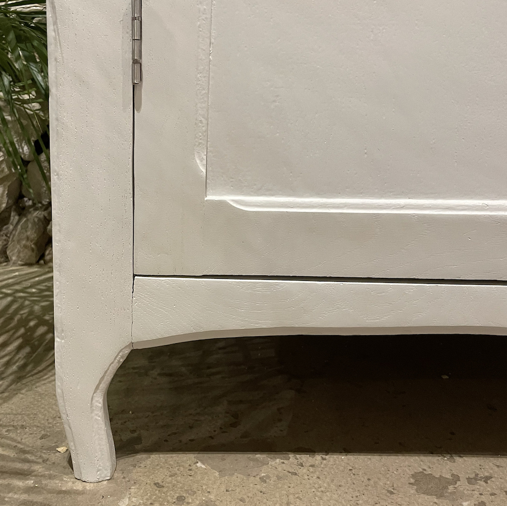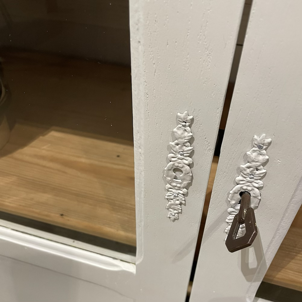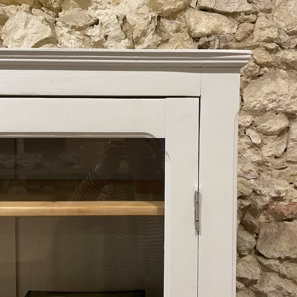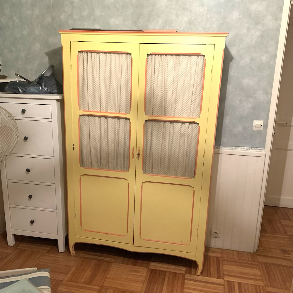 On dépose les portes et les étagères. Les charnières sont remplacées car les anciennes ne sont plus réutilisables. L’ensemble est poncé avant application de la peinture à l’intérieur et à l’extérieur de l’armoire ainsi que sur les portes. Les étagères restent naturelles. Les ferrures sont nettoyées. Cette fois-ci, pas de rideaux pour cette armoire/vitrine qui a retrouvé sa fonction première !