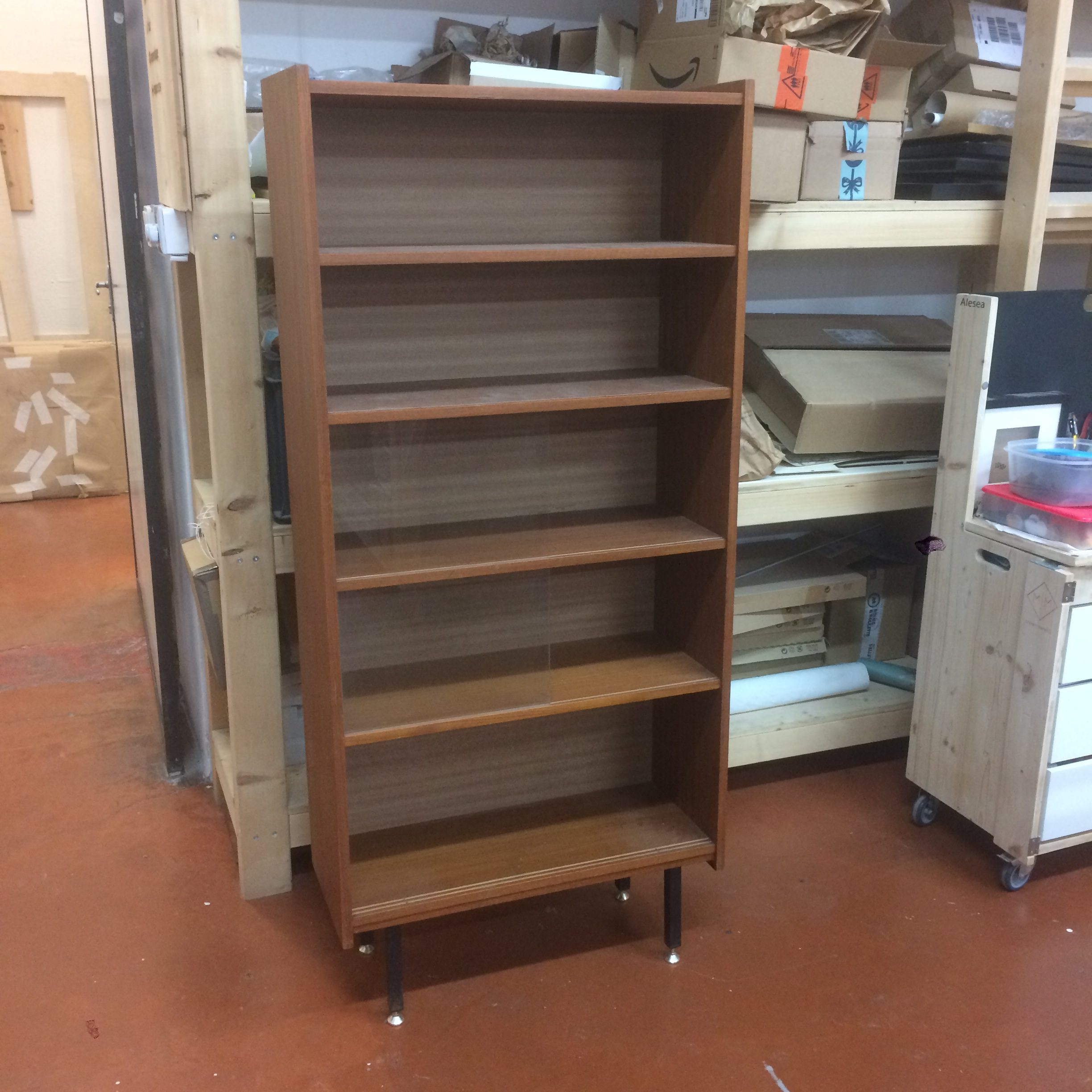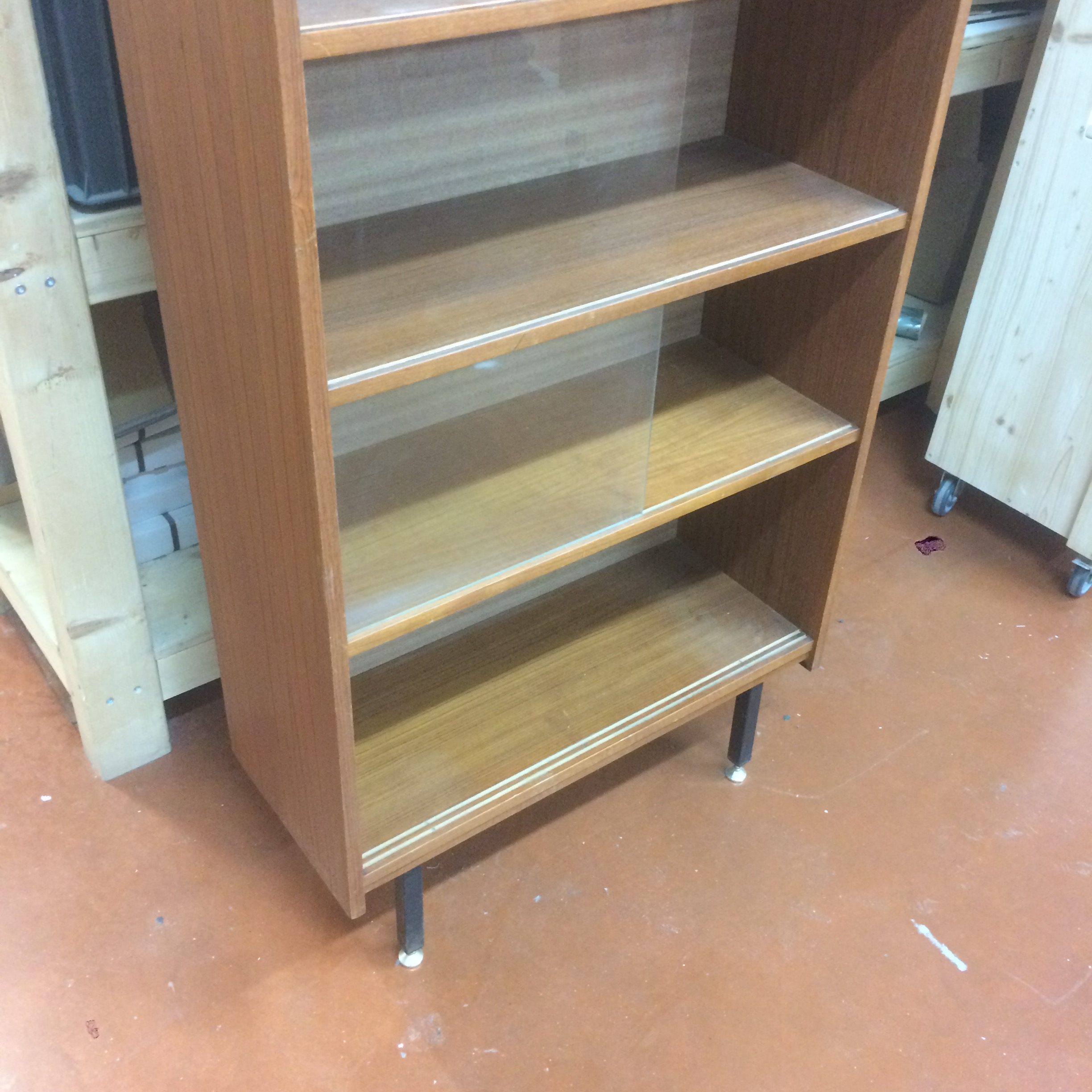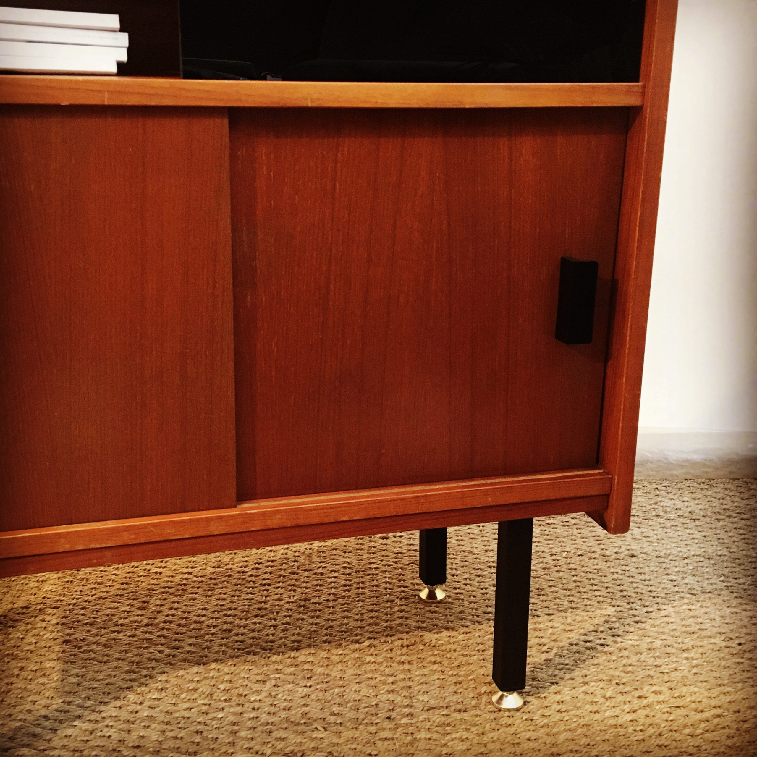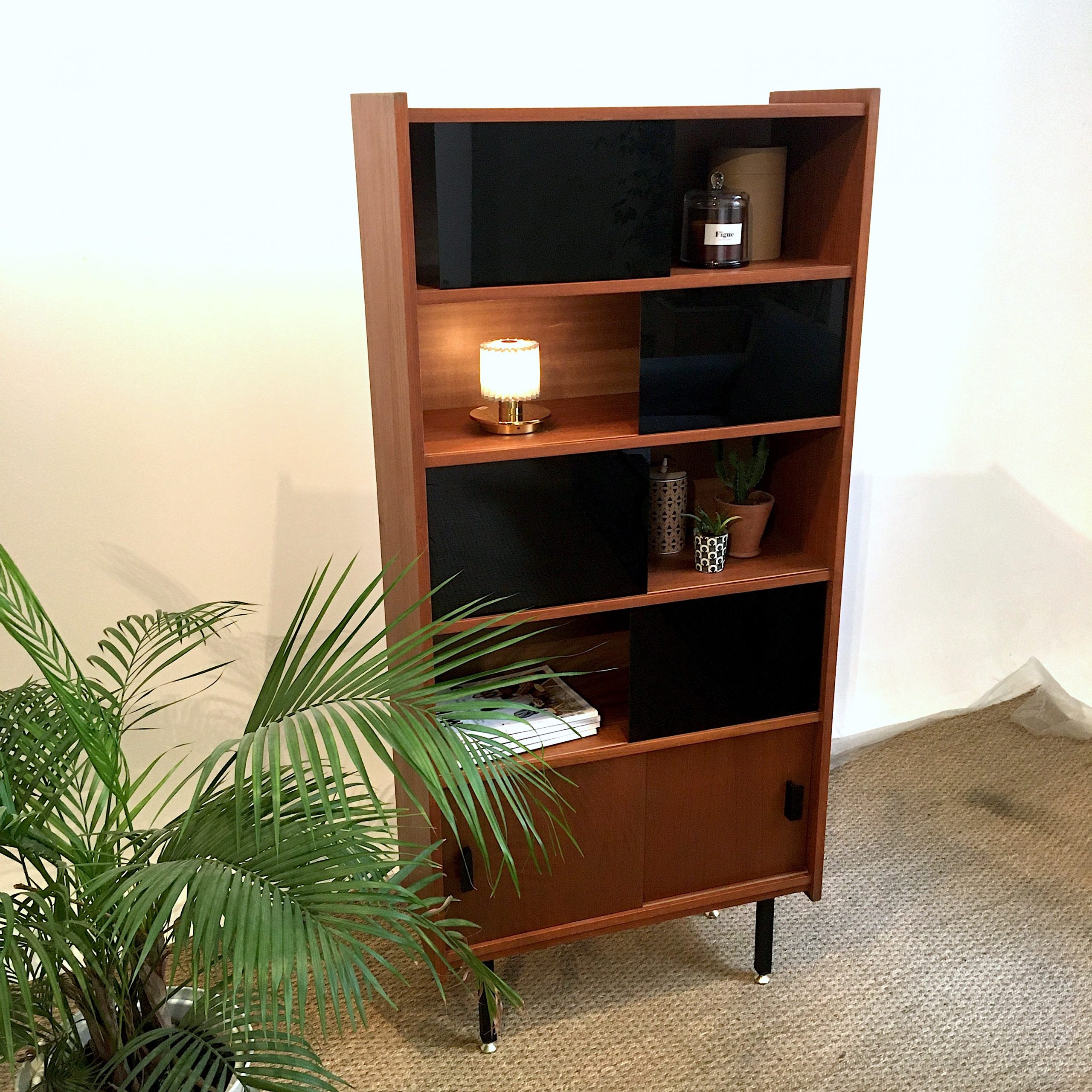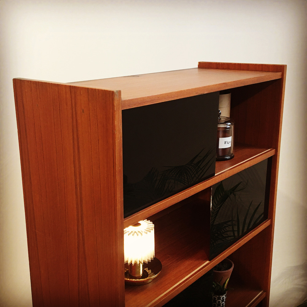 On commence par démonter et nettoyer le meuble pour visualiser les zones à traiter. On comble ensuite les différents accidents avec de la pâte à bois teintée. L’ensemble de la structure est traitée à la cire pour nourrir et raviver le bois. Les pieds en métal sont poncés et repeints en noir mat. Les vitres modulables, à l’origine transparentes, sont remplacées par des vitres noires : brillantes au recto et mates au verso pour encore plus de modularité.