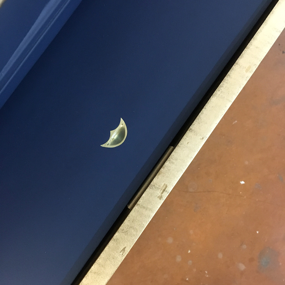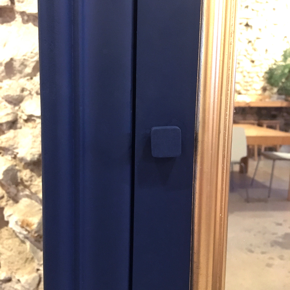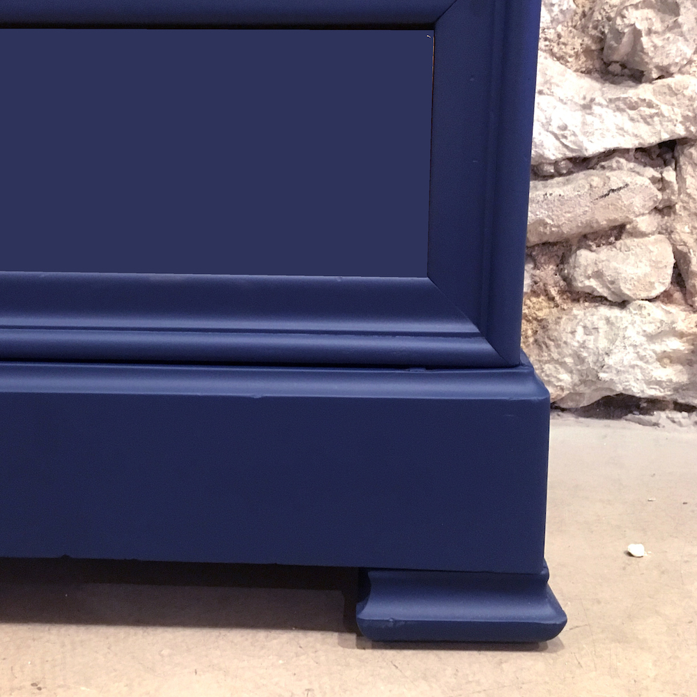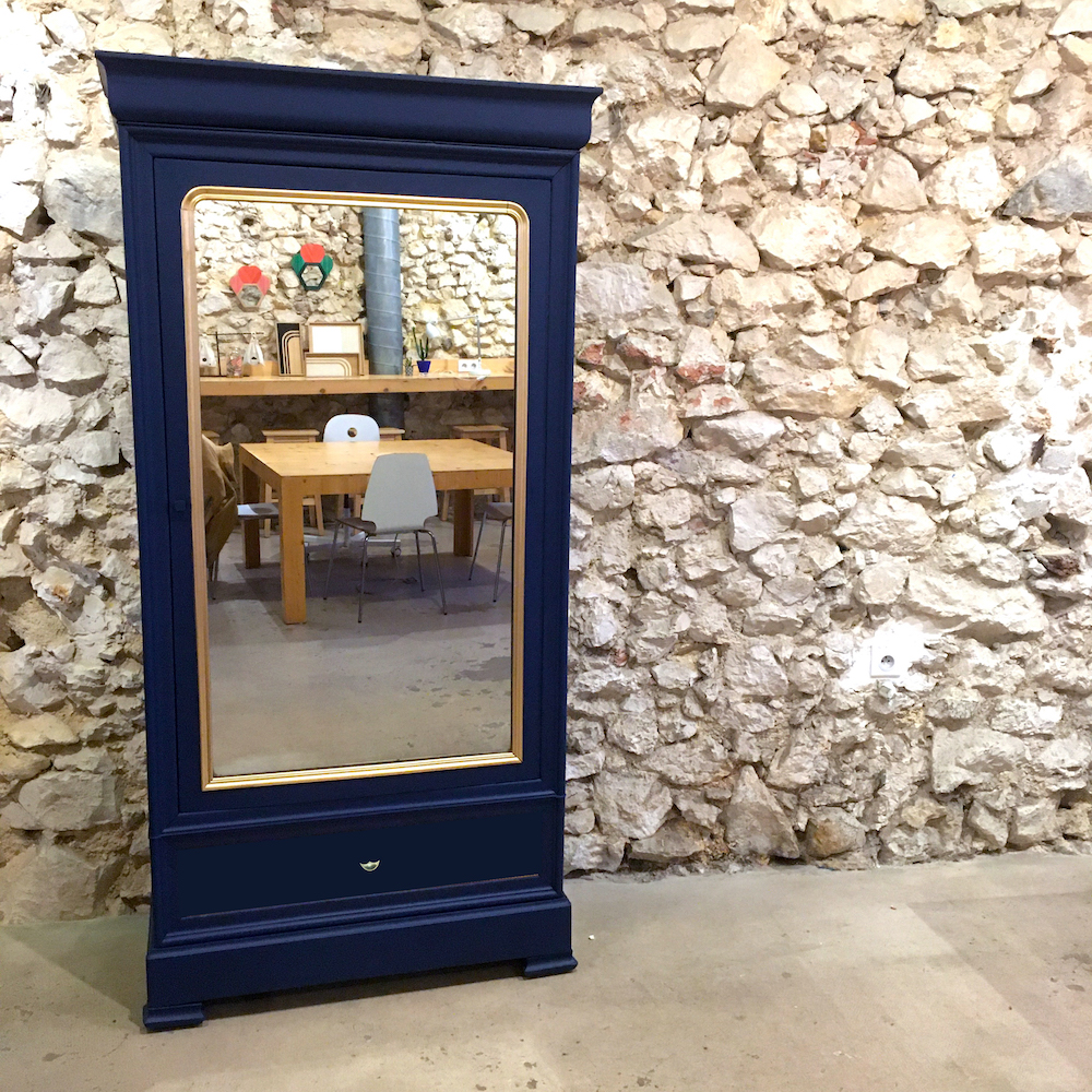 On retire les étagères, le tiroir et les ferrures. On répare la corniche qui a été abîmée dans le transport. On remplace la serrure (sans clé) par un poignée. Les étagères sont poncées et cirées. On protège le miroir pour poncer et peindre. Les moulures sont peintes en dorées et le reste du meuble (intérieur et extérieur) dans un magnifique bleu nuit.