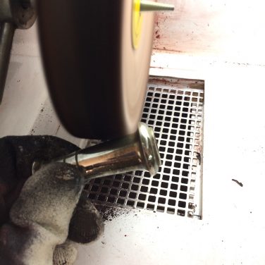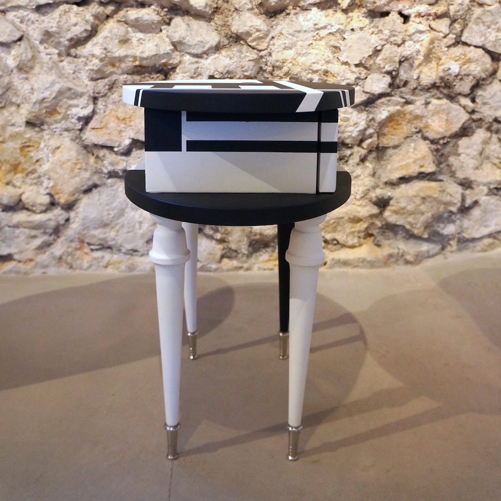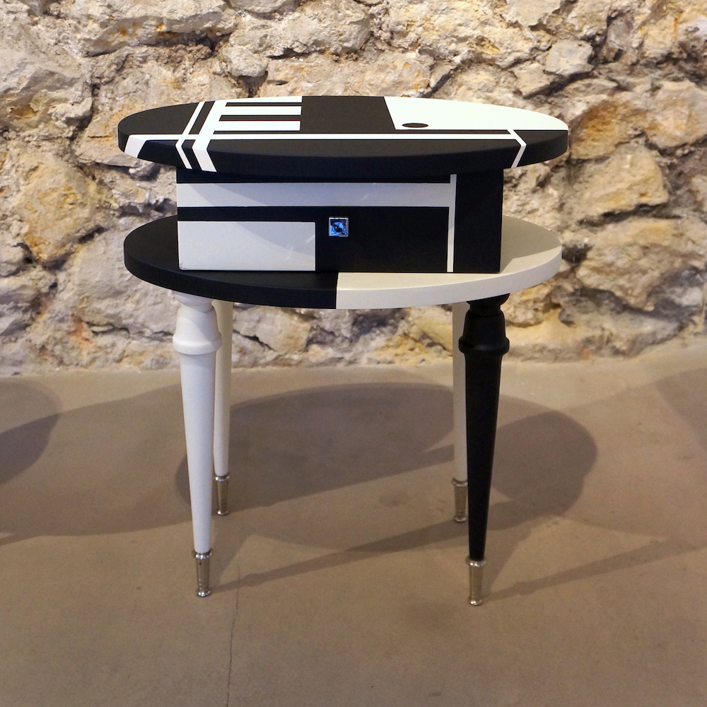 Les pieds en laiton sont passés par la polisseuse de l’atelier bijoux pour retrouver un brillant argent. Les poignées ont été remplacées et le tout a été protégé par un vernis mat incolore.