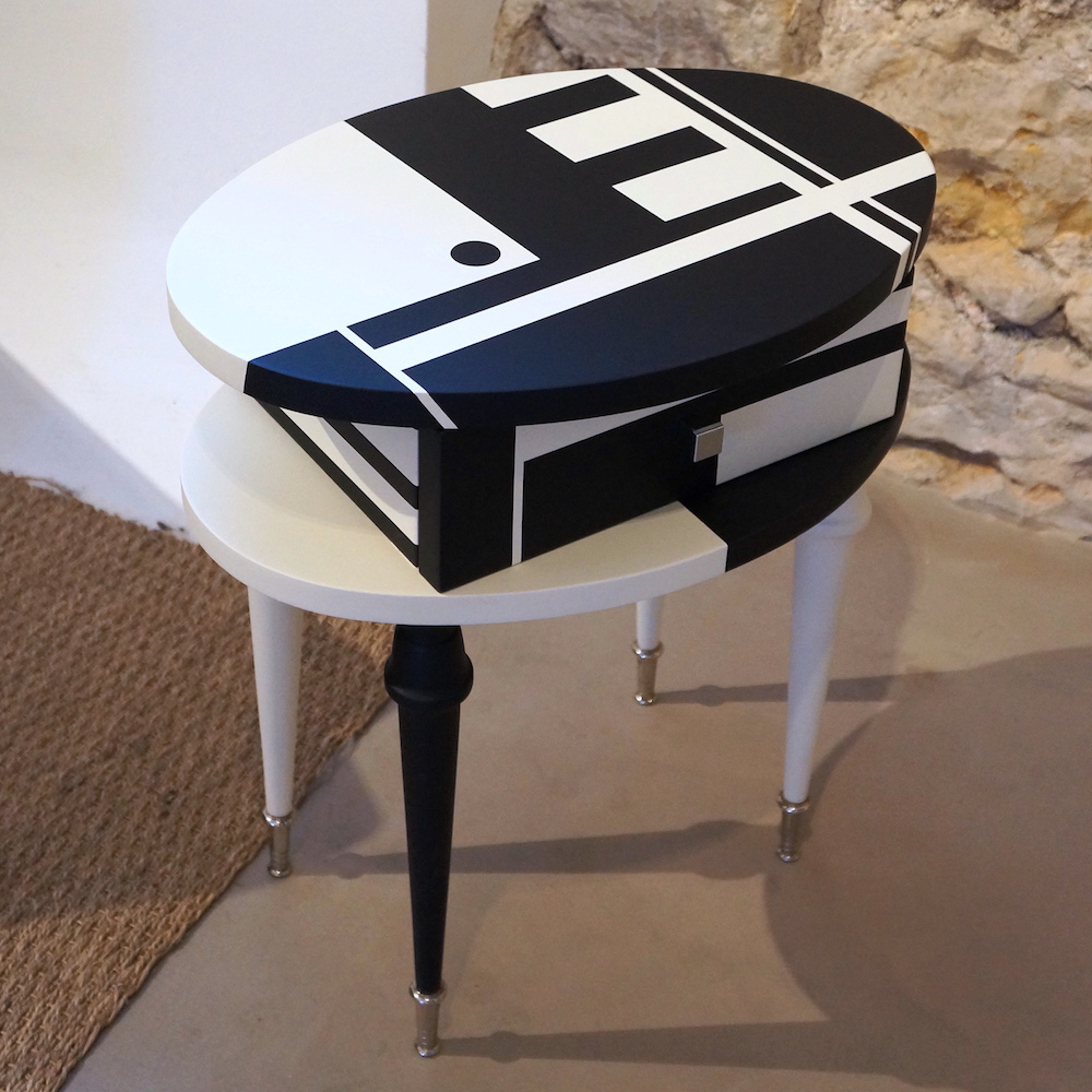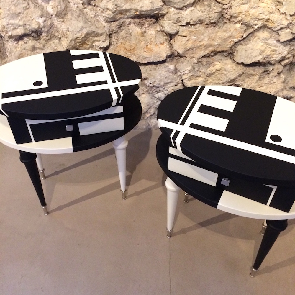Préalablement, les meubles ont été poncés et nettoyés, nous avons ensuite réalisé le motif à la peinture puis nous nous sommes occupé des finitions.