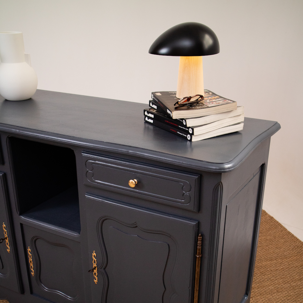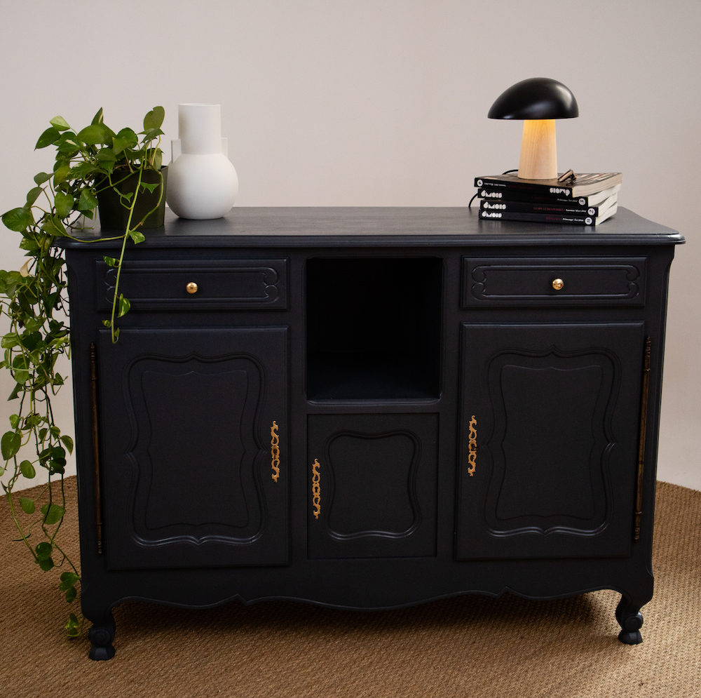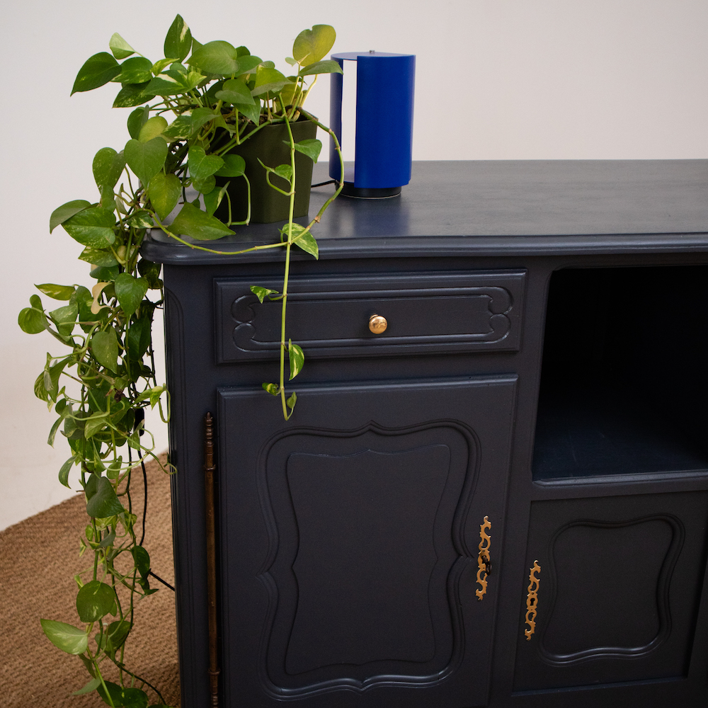 On démonte les portes et on retire les tiroirs. À l’intérieur, un vieux papier vinyle qu’il faut décoller. On ponce l’intégralité du meuble, on applique la sous-couche et une peinture. Il ne reste plus qu’à remonter l’ensemble. Pour la finition, les poignées d’origine sont remplacées et les entrées de clés rehaussées en doré.