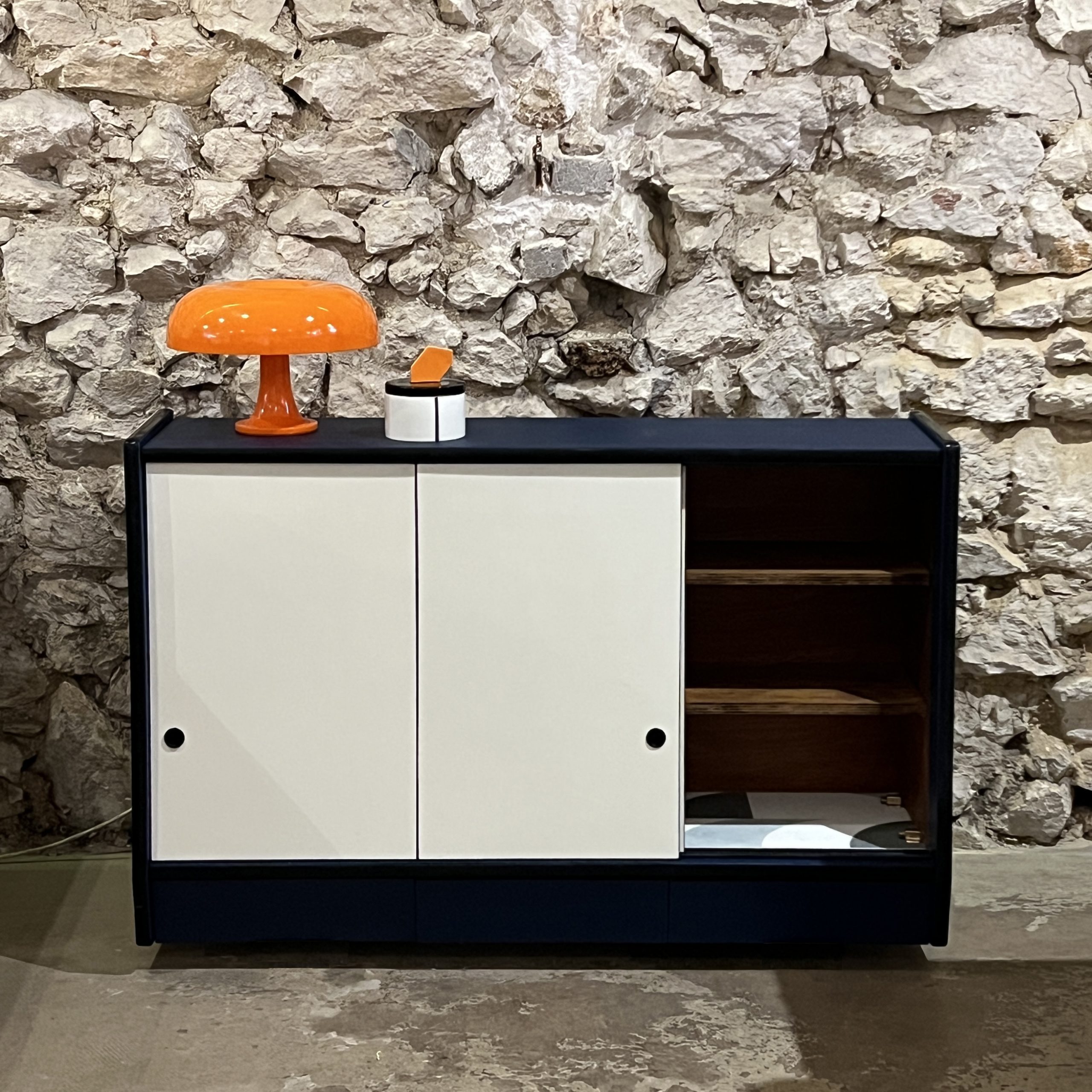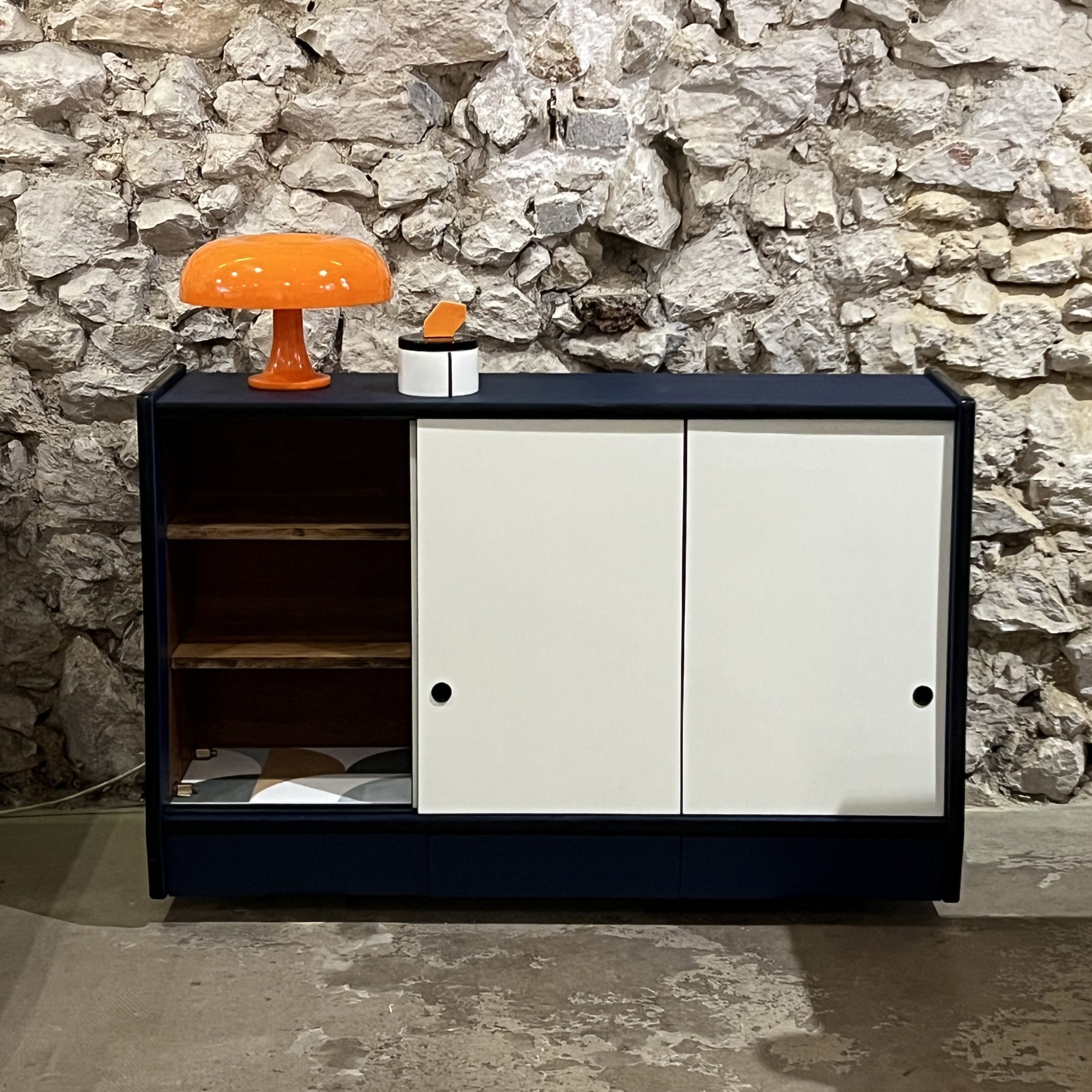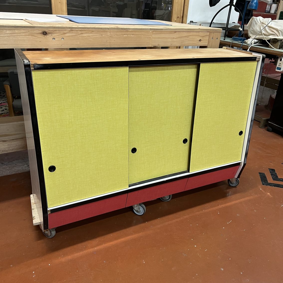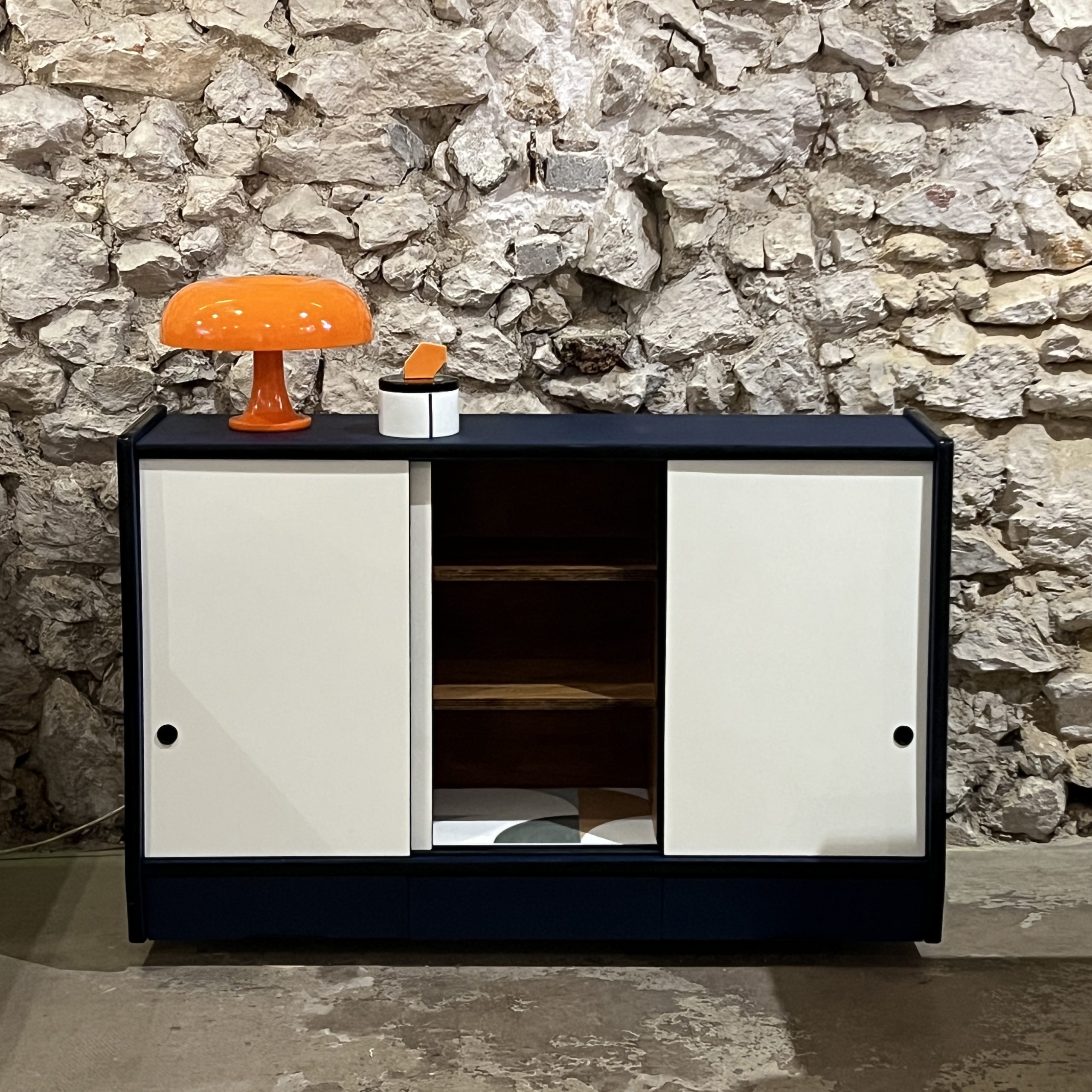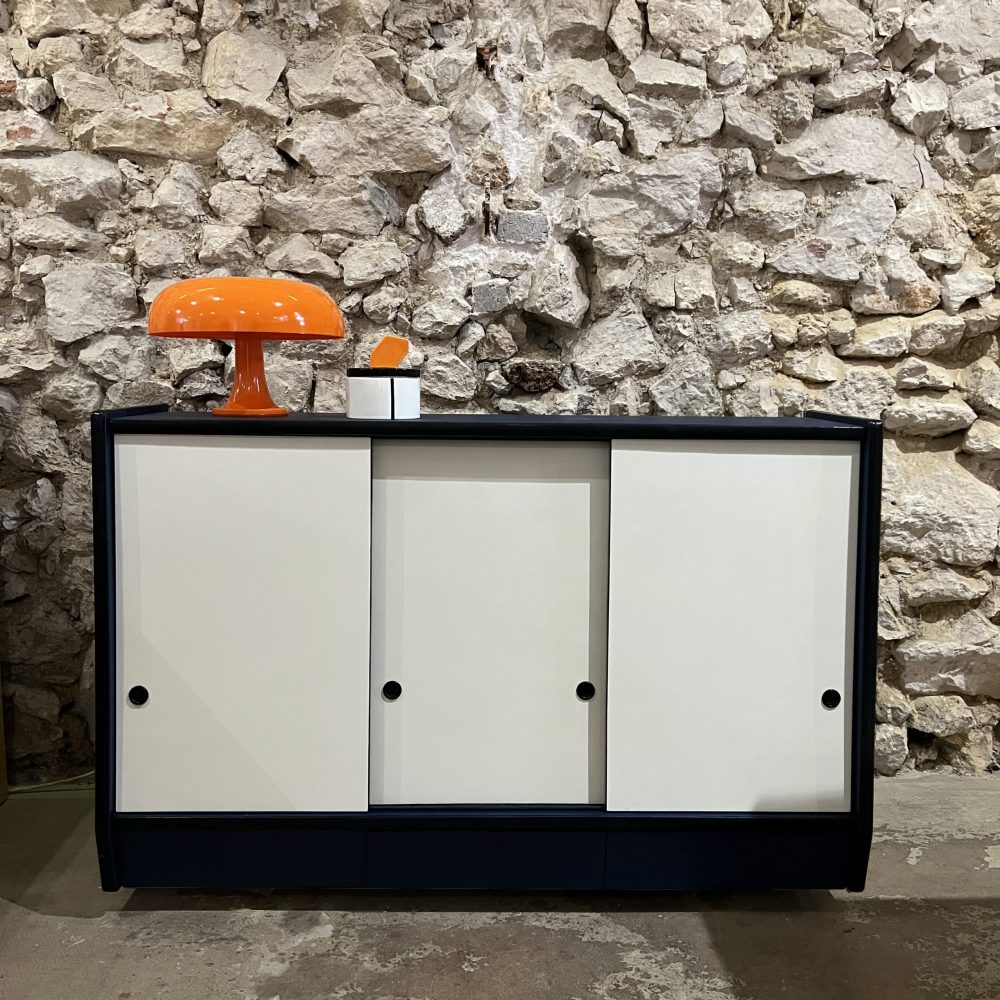 Ce meuble est à l’origine un meuble haut de cuisine en Formica, matériau emblématique des cuisines de l’époque pour sa résistance, sa facilité d’entretien et sa stabilité dans le temps. La façade est composée de trois portes coulissantes montées sur rails et de 3 tiroirs.