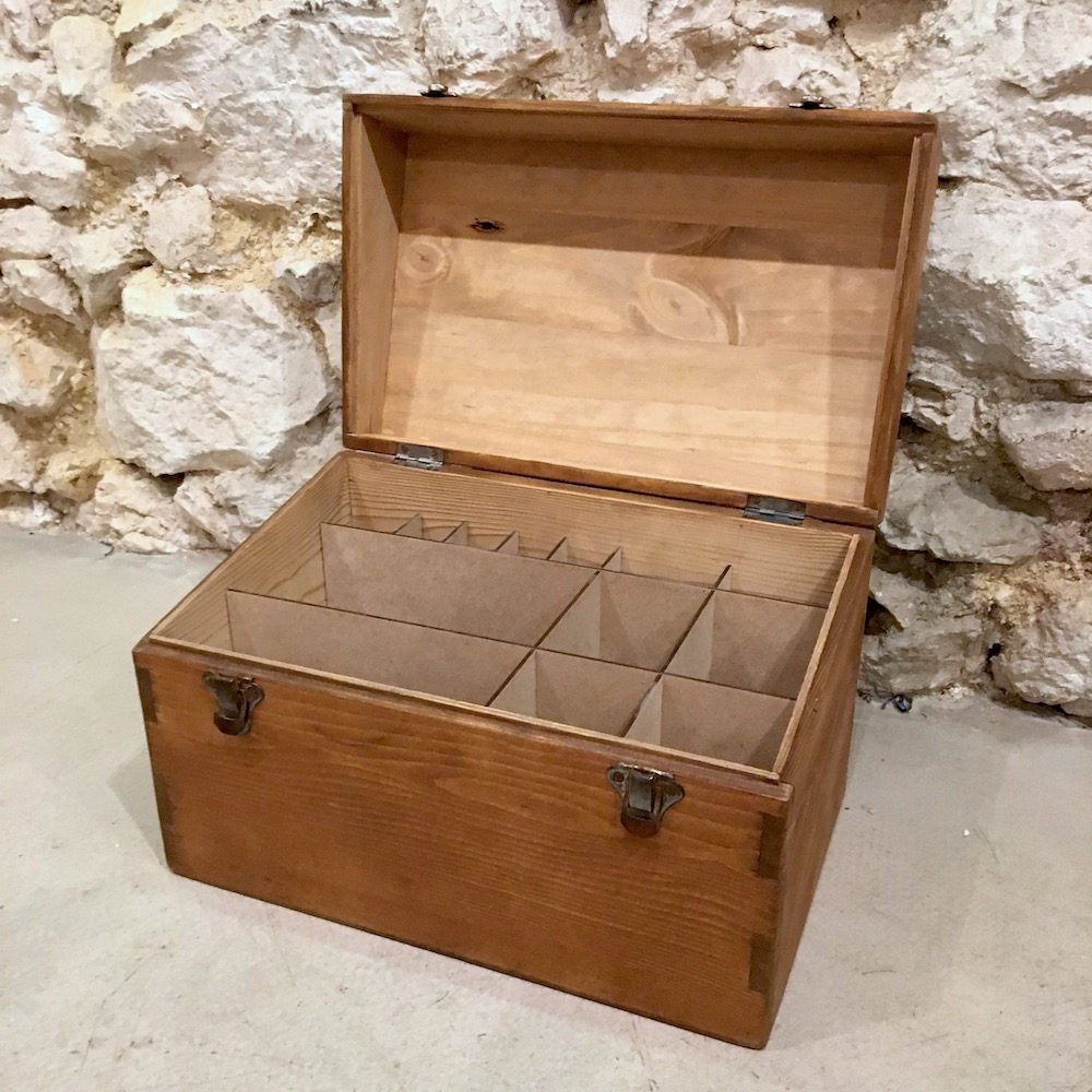 Un coffre en pin muni de 2 fermoirs grenouillères qui sert de rangement pour les accessoires de cirage.