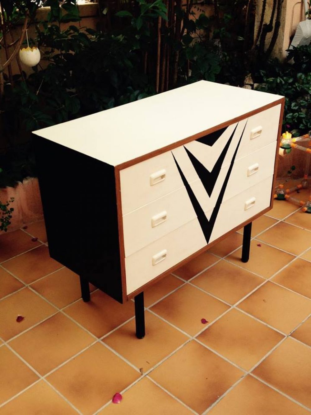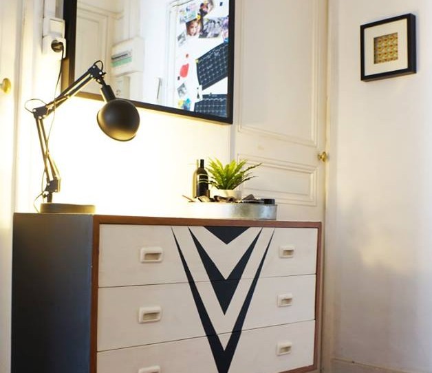 Le choix du noir et blanc s’est imposé pour son efficace sobriété. Le graphisme quant à lui est venu de l’envie de redonner classe et dynamisme à ce meuble resté dans l’ombre. Nous avons choisi une peinture mate qui accentue l’aspect élégant de cette commode.