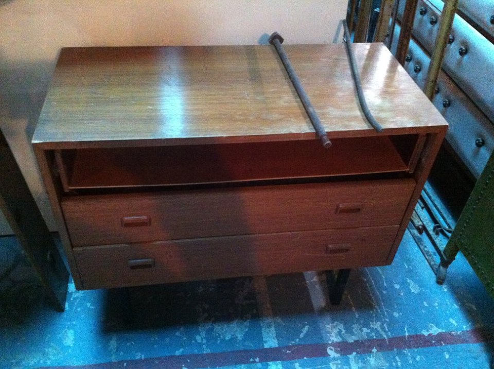 Un placage bois en bon état, un tiroir à réparer et des pieds droits en métal noir, typiques des années 50… Cette commode 50’s méritait bien qu’on s’intéresse de nouveau à elle.