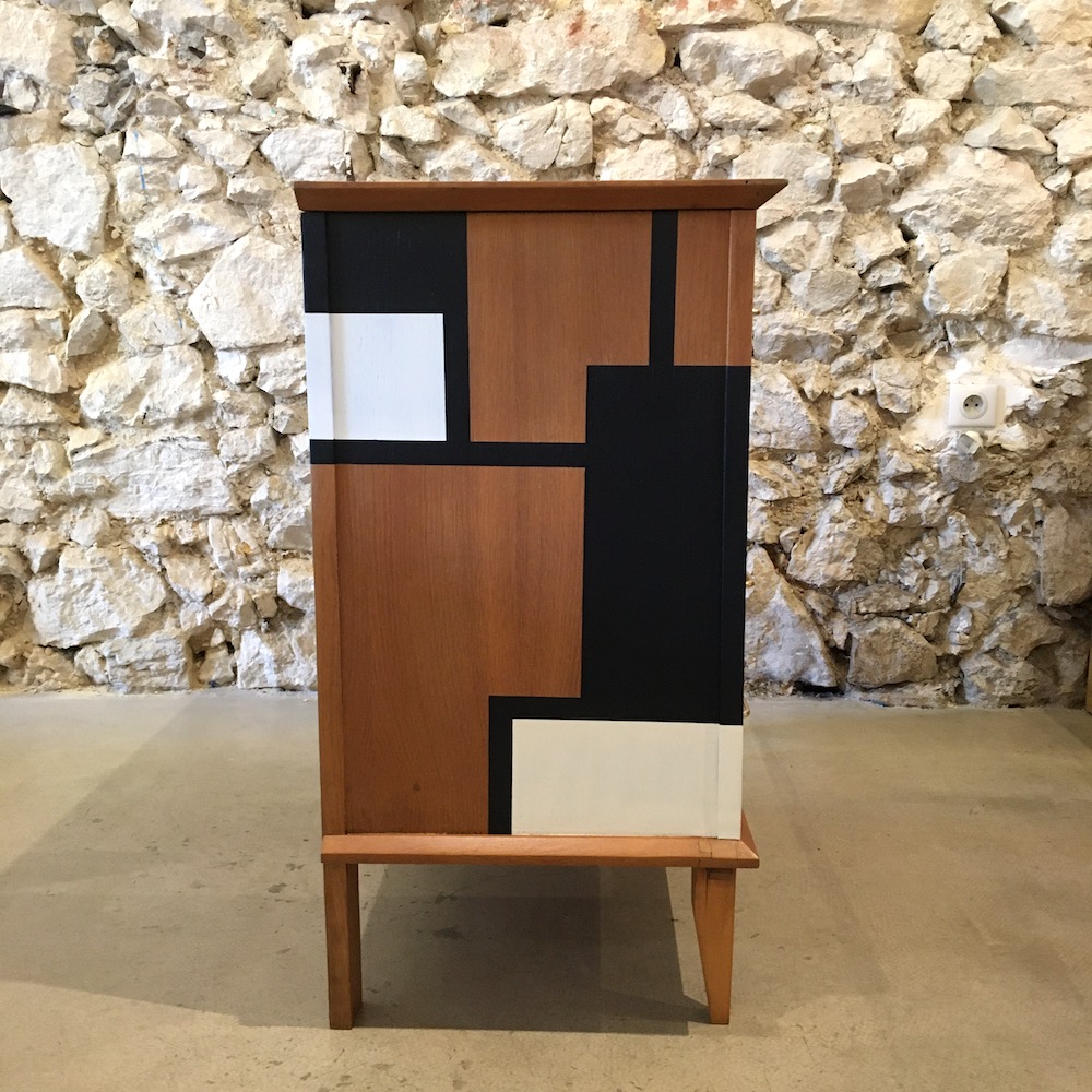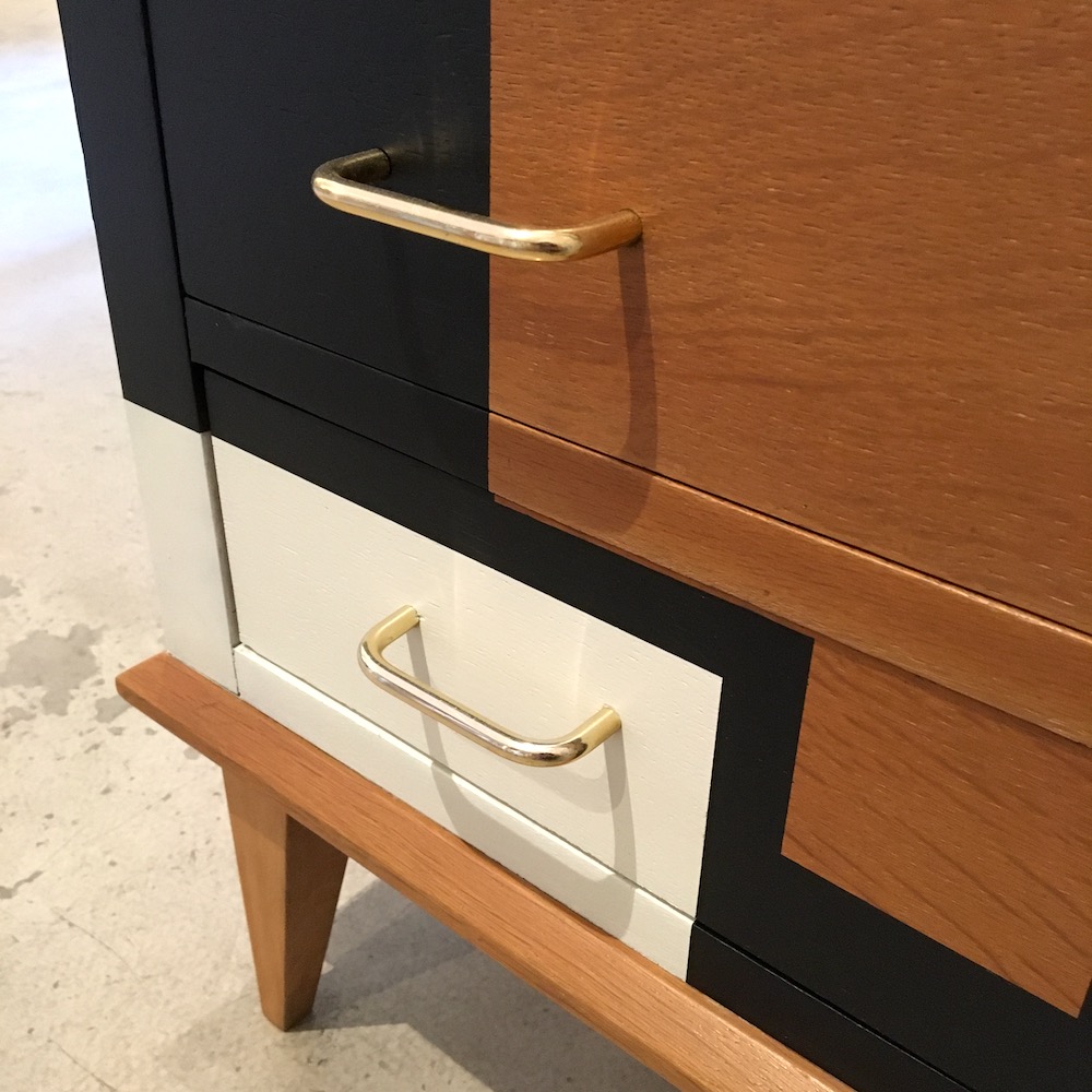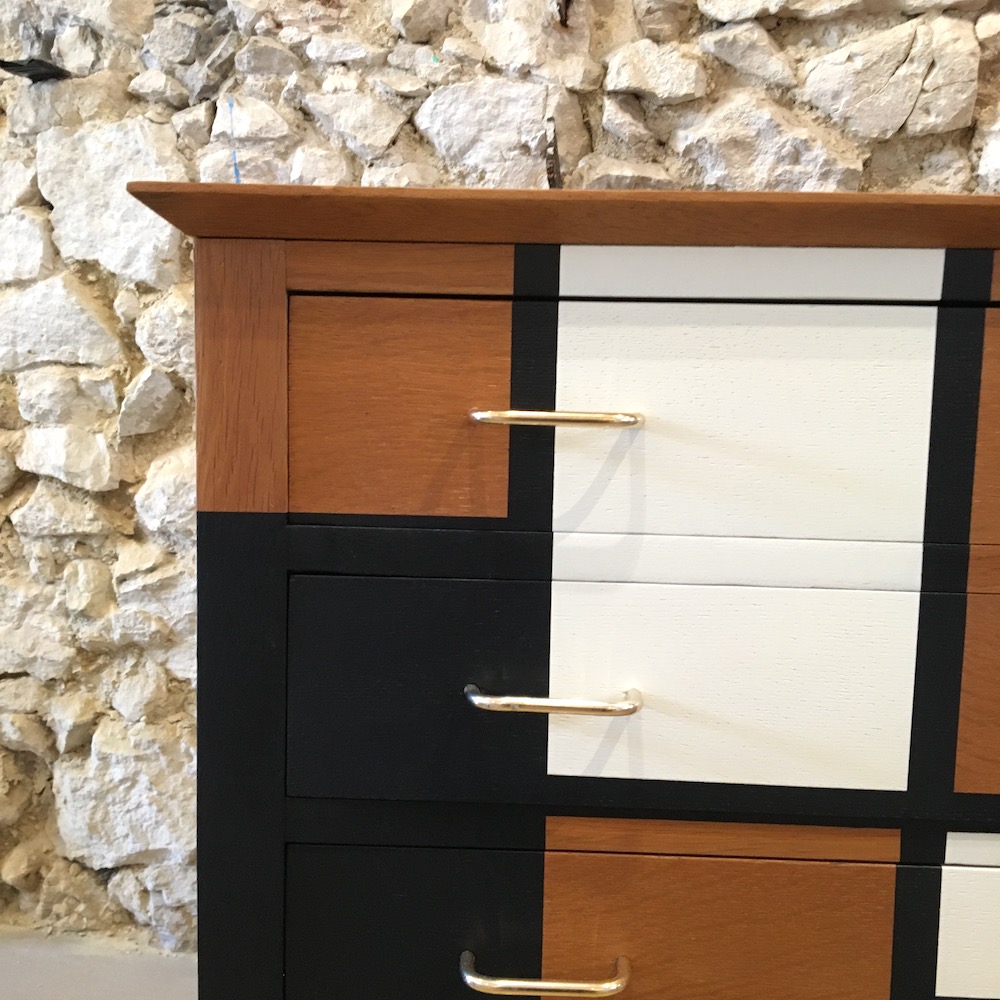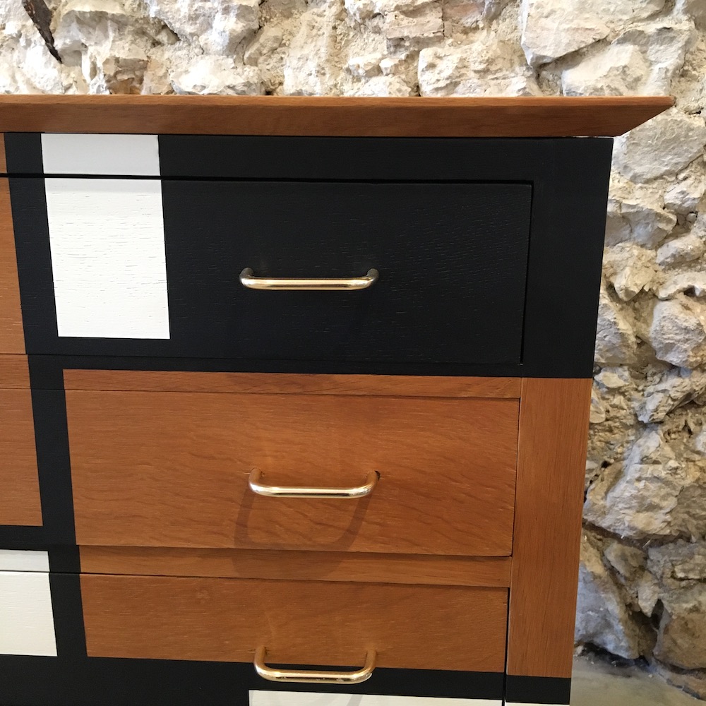 On nettoie et on ponce l’intégralité du meuble afin d’évaluer précisément l’état de la structure. Les éclats sont rebouchés à la pâte à bois, puis poncés. On applique un vernis teinté « chêne doré » pour donner plus de chaleur à la couleur d’origine et on passe à la réalisation du motif. On applique les scotches de masquage en plusieurs temps pour dessiner ce qui sera le motif final. Une fois réalisé, le motif est protégé par un vernis mat incolore. Les poignées en laiton sont nettoyées avec de la paille de fer.