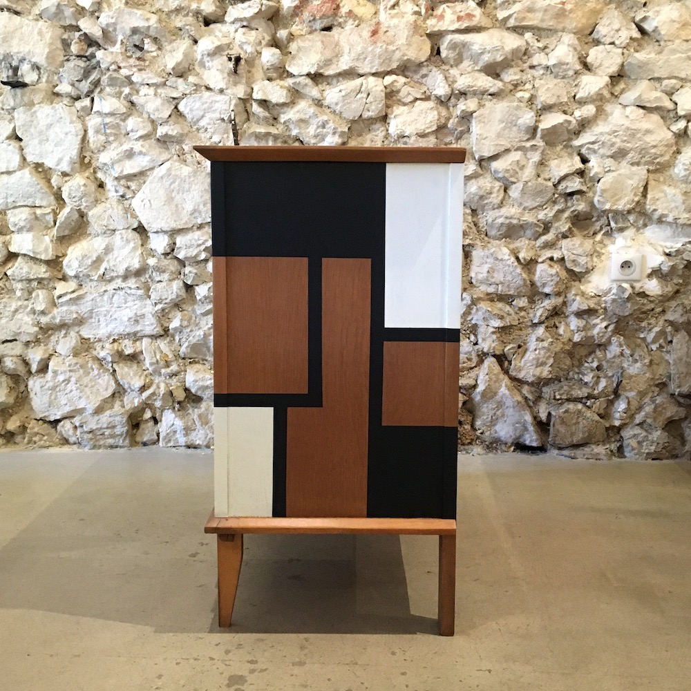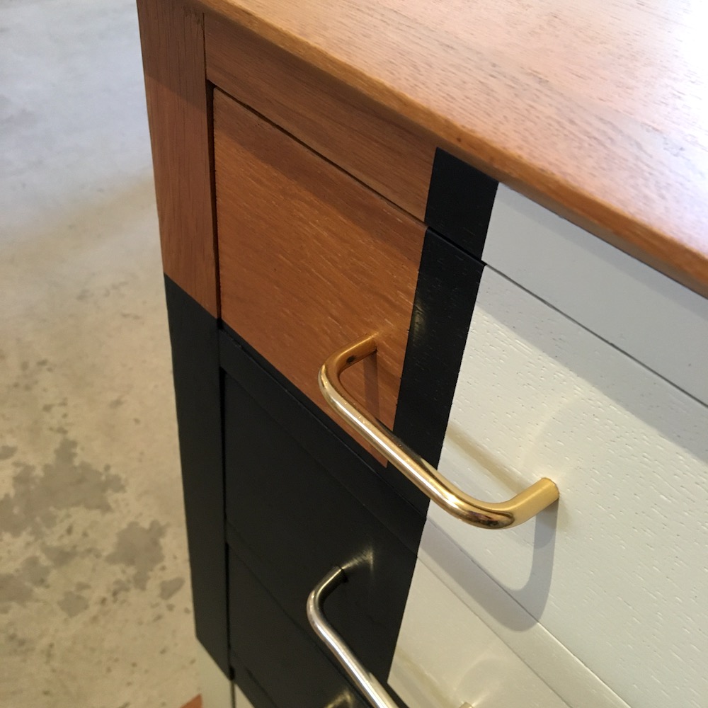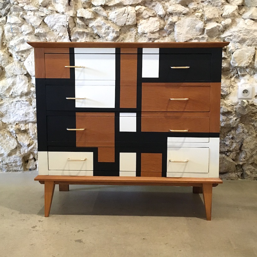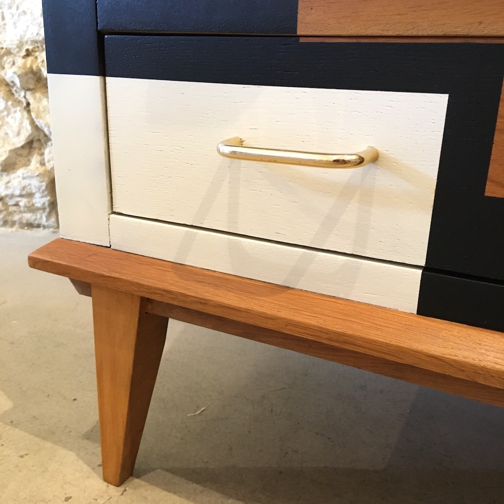 On nettoie et on ponce l’intégralité du meuble afin d’évaluer précisément l’état de la structure. Les éclats sont rebouchés à la pâte à bois, puis poncés. On applique un vernis teinté « chêne doré » pour donner plus de chaleur à la couleur d’origine et on passe à la réalisation du motif. On applique les scotches de masquage en plusieurs temps pour dessiner ce qui sera le motif final. Une fois réalisé, le motif est protégé par un vernis mat incolore. Les poignées en laiton sont nettoyées avec de la paille de fer.