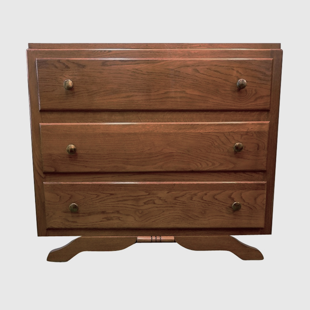 Une commode de style art deco, composée de 3 tiroirs et d’un piètement en forme de moustaches.