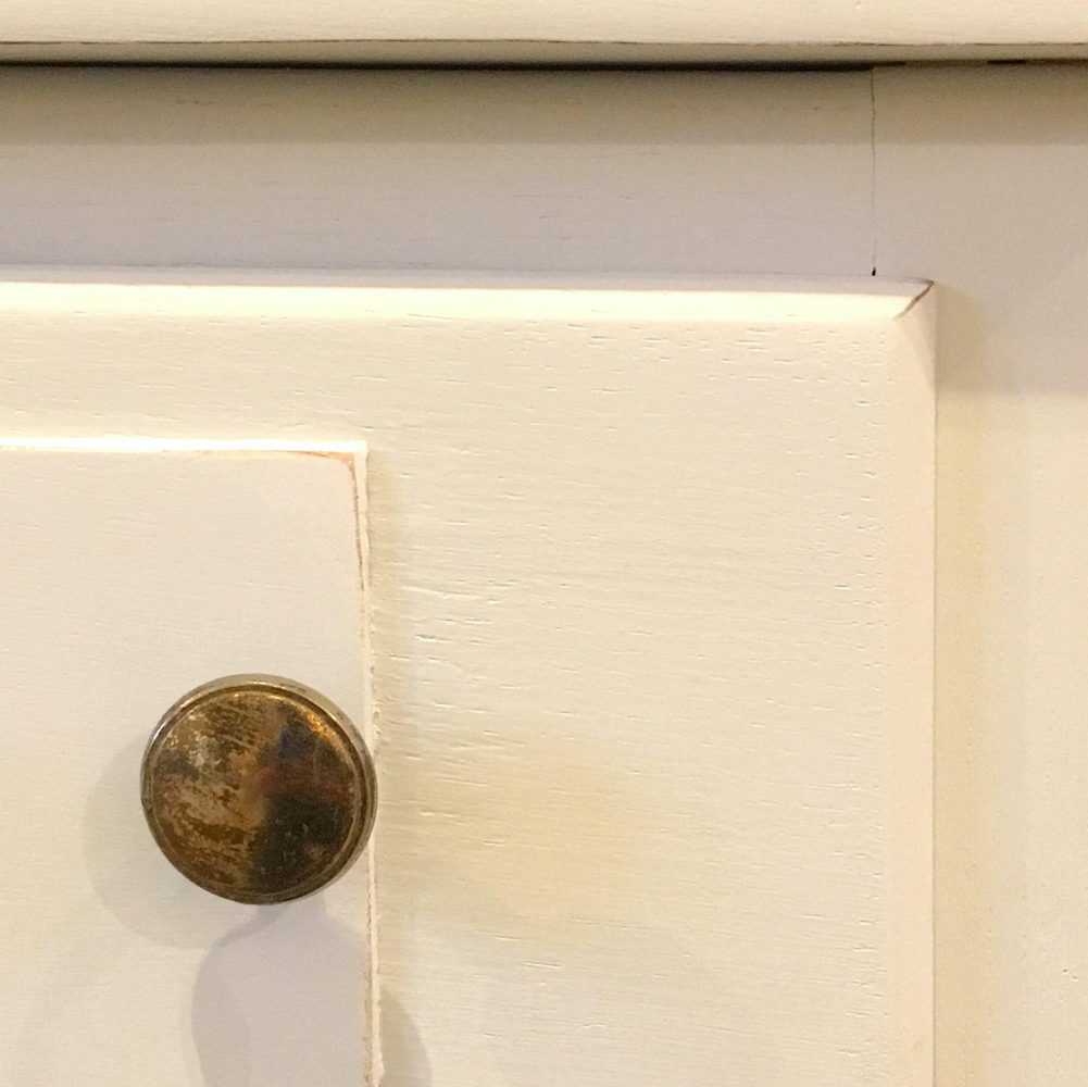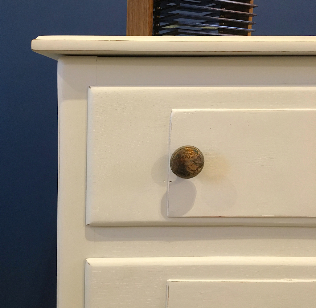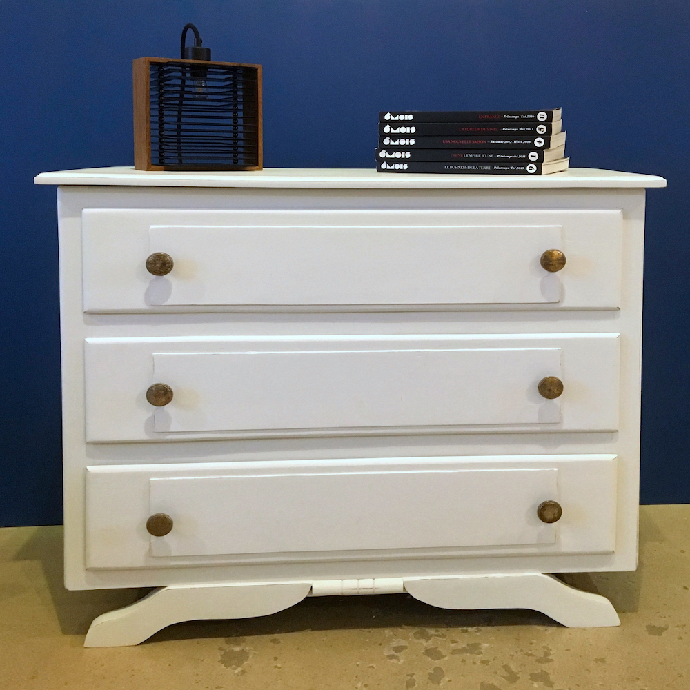On retire les poignées et ponce l’ensemble de la commode afin d’appliquer une sous-couche et la peinture Blanc cassé. On ponce légèrement les angles et les arêtes du meuble pour créé un effet vieilli. On découpe sur-mesure des fonds pour les tiroirs, peints dans la même couleur.