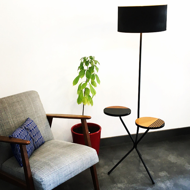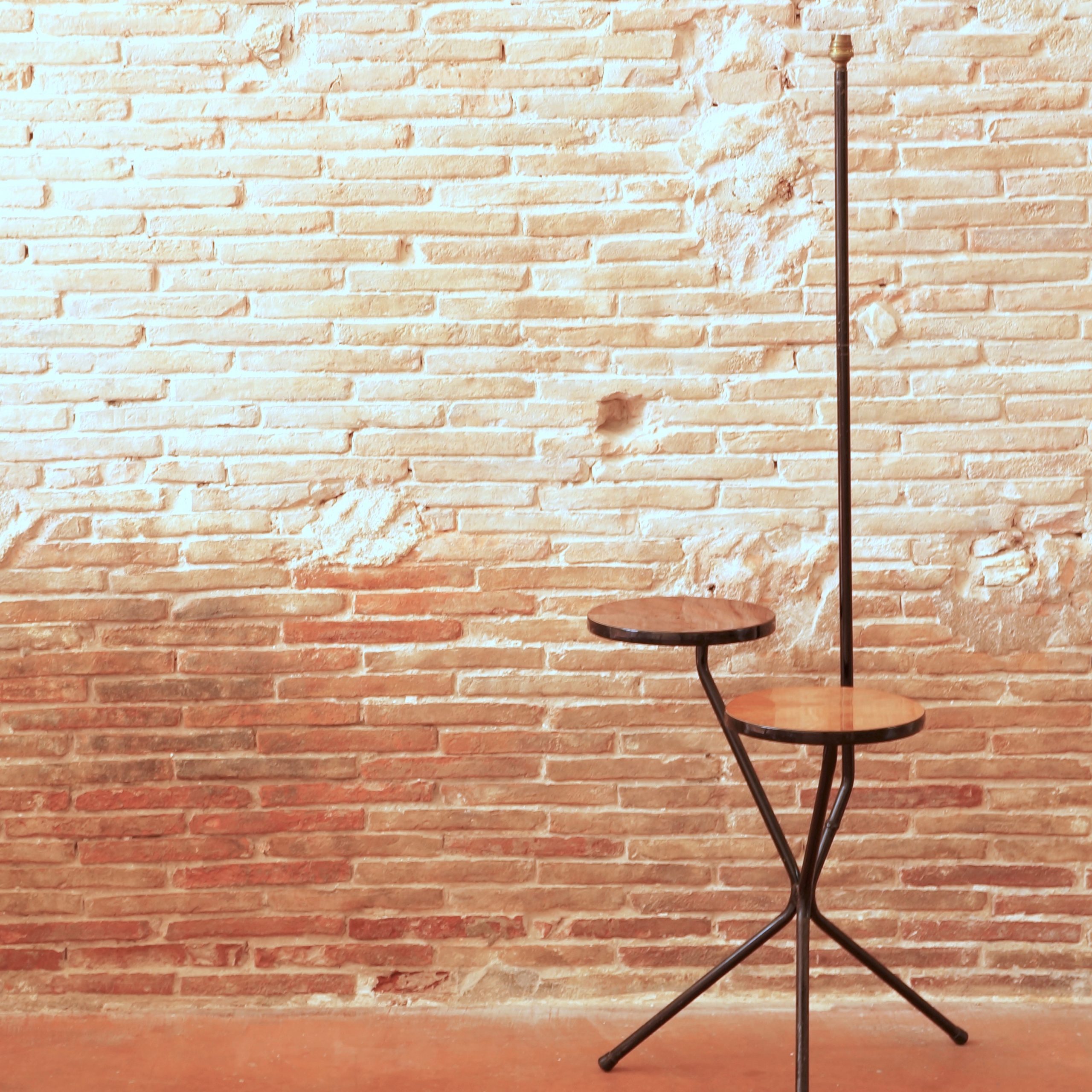 Un lampadaire tripode des années 50 au design épuré et efficace. Le piètement est en métal et les 2 tablettes sont en formica de 2 teintes différentes.