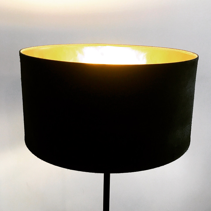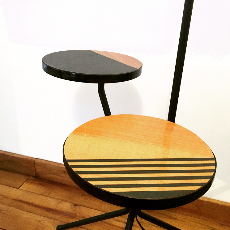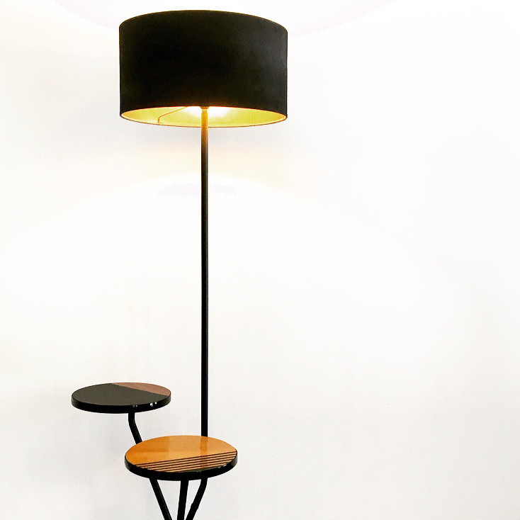 On retire les tablettes en formica et le vieux système électrique. On nettoie l’ensemble à l’acétone avant de peindre en noir mat les parties en métal. Sur les tablettes, on retire le cerclage afin de réaliser un motif graphique simple qui rappelle le piètement . On intègre un nouveau système électrique, ainsi qu’un nouvel abat-jour. On achète un modèle standard dans le commerce, à l’intérieur duquel on peint en doré pour une lumière plus chaude et pour ajouter une touche chic.