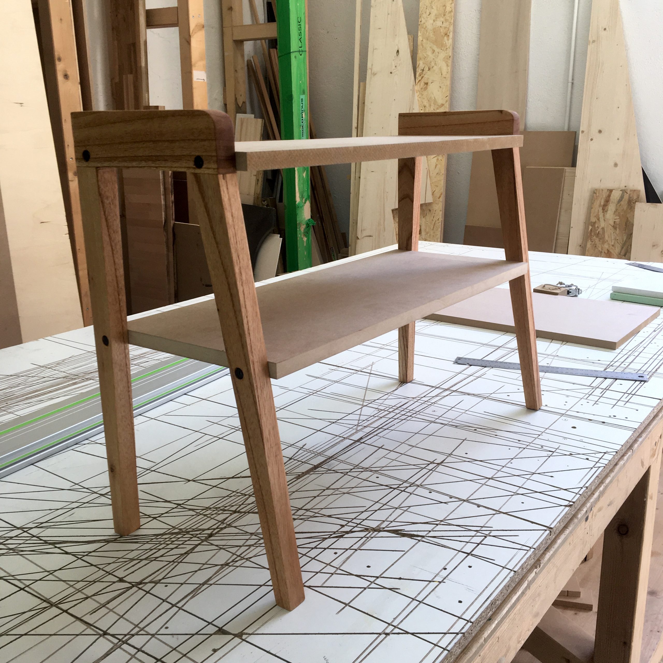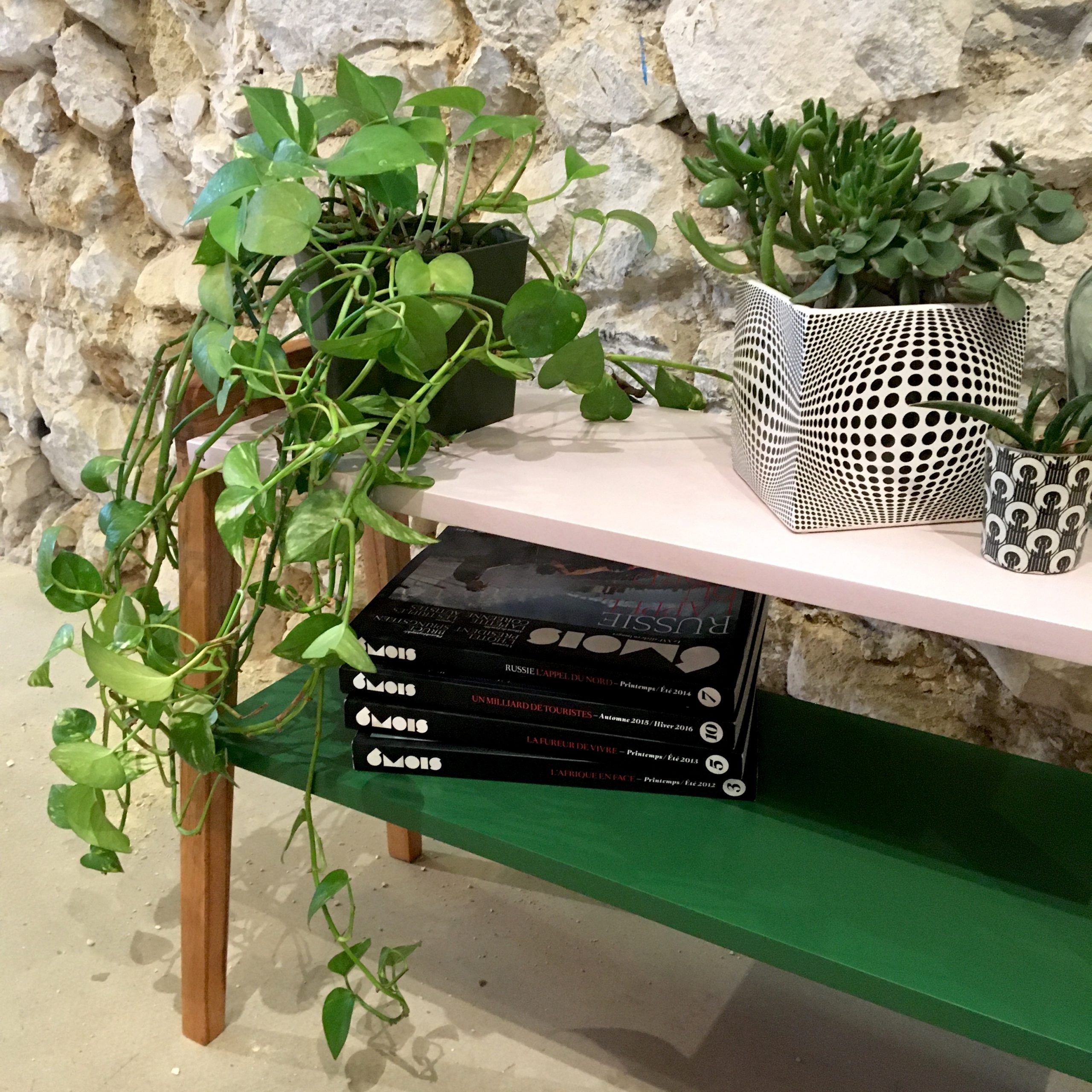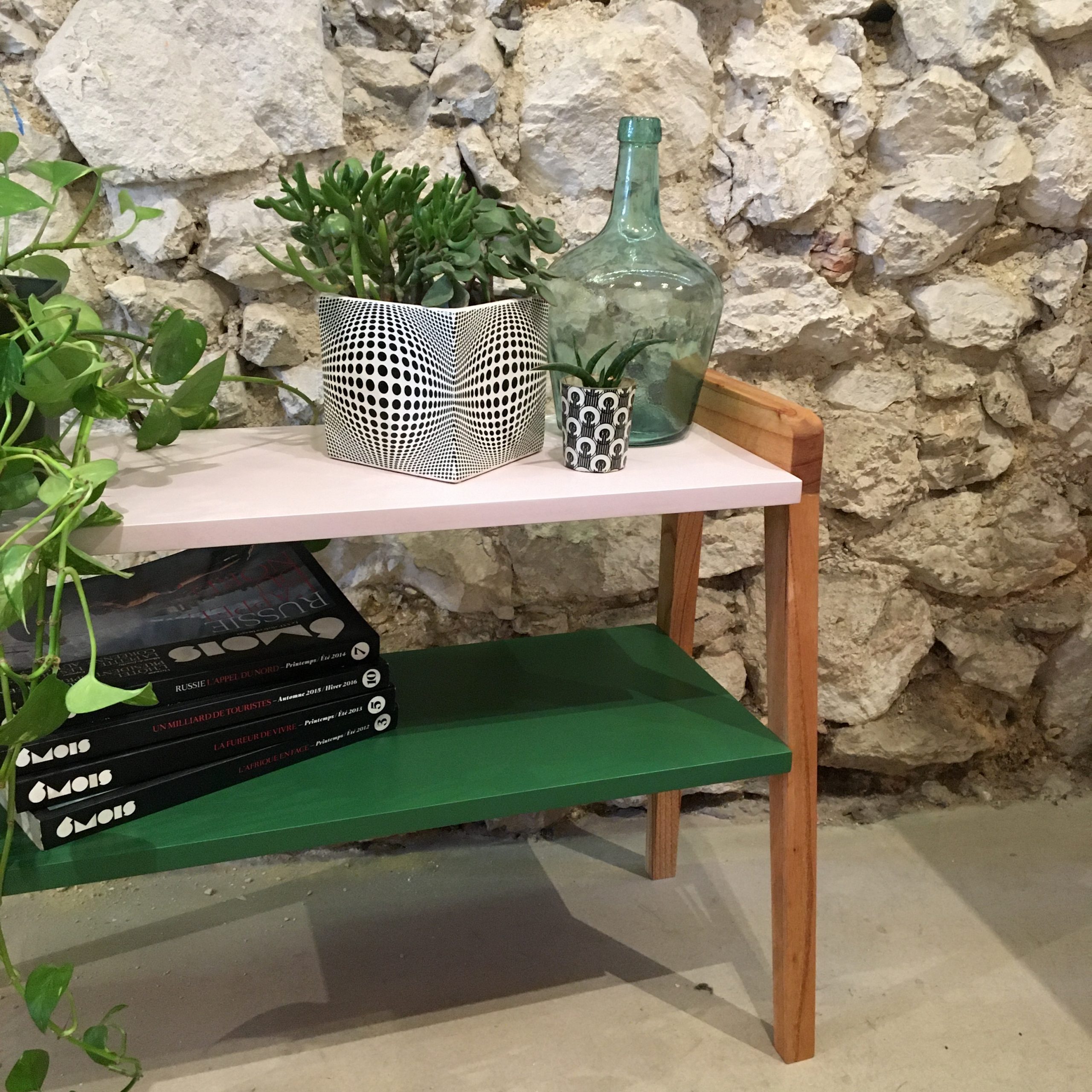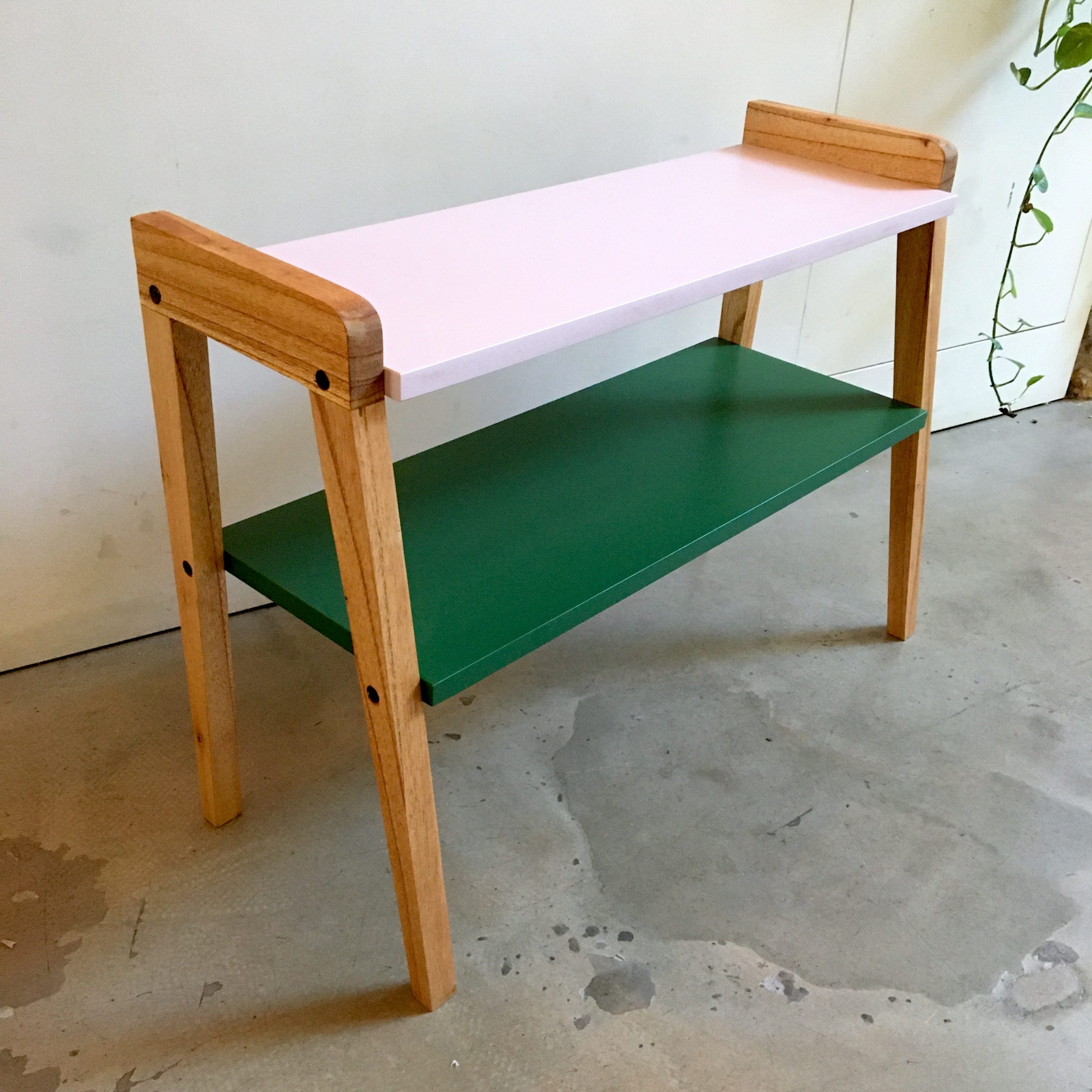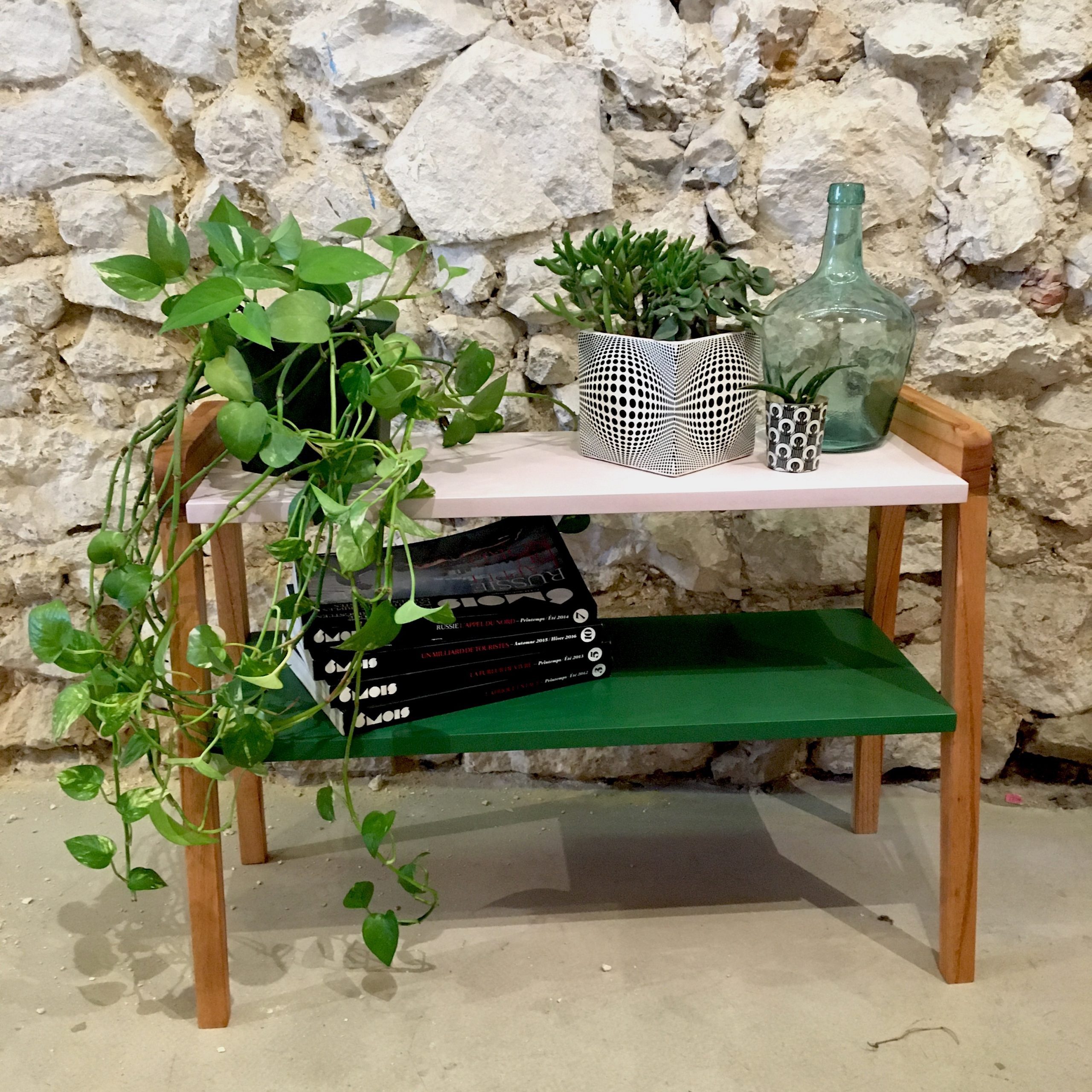 On démonte le meuble et on ponce l’intégralité du piètement que l’on va ensuite cirer pour nourrir le bois et révéler la couleur d’origine. On crée de nouveaux plateaux, plus longs, dans du médium de 19mm, récupéré dans les chutes de bois de l’atelier. Le médium est poncé, puis sous-couché avant d’appliquer la peinture (vert Era et rose Saudade) et le vernis (mat incolore). Puis on remonte le tout.