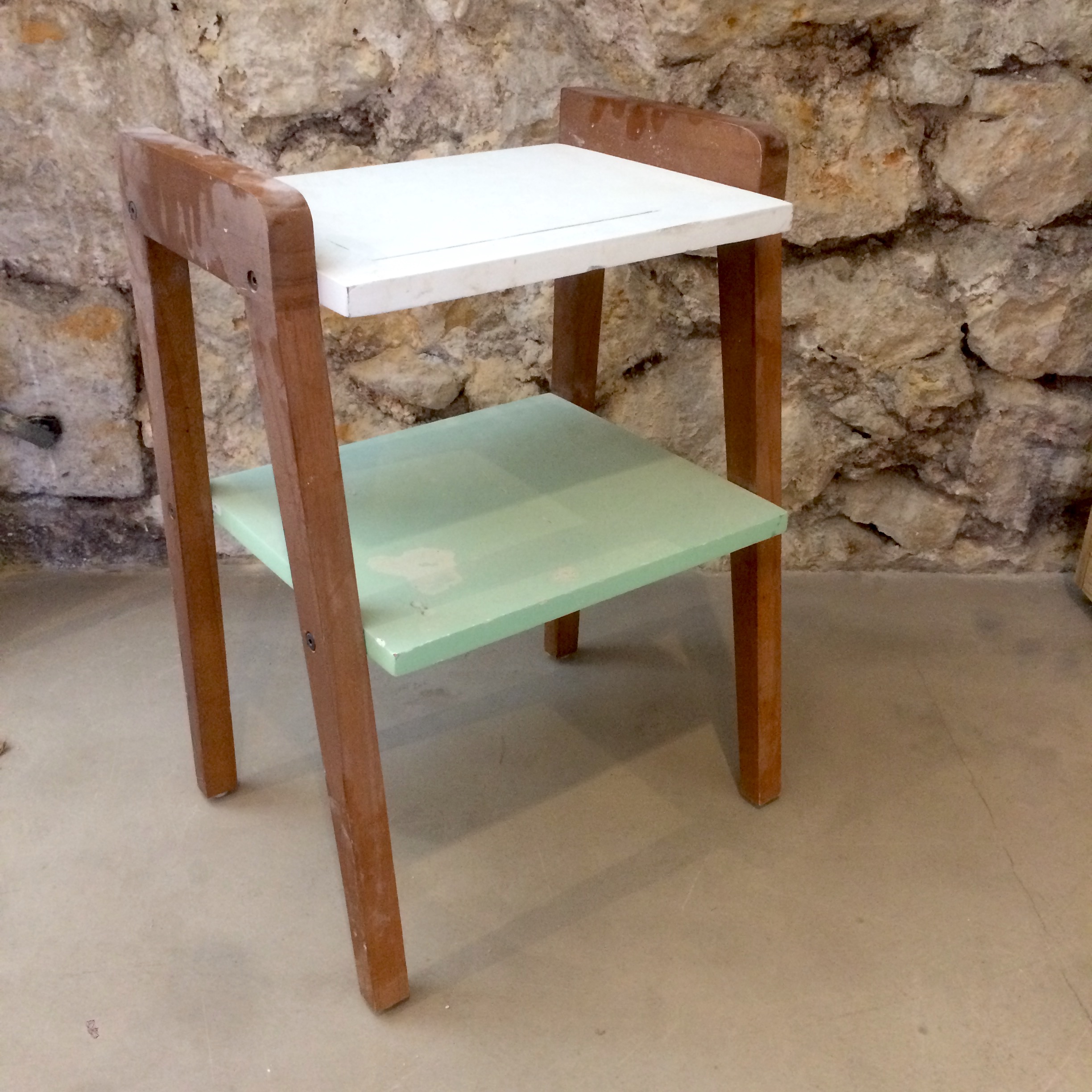 Les plateaux, très endommagés ont été repeints de façon anarchique et le vernis du piètement manque d’éclat.