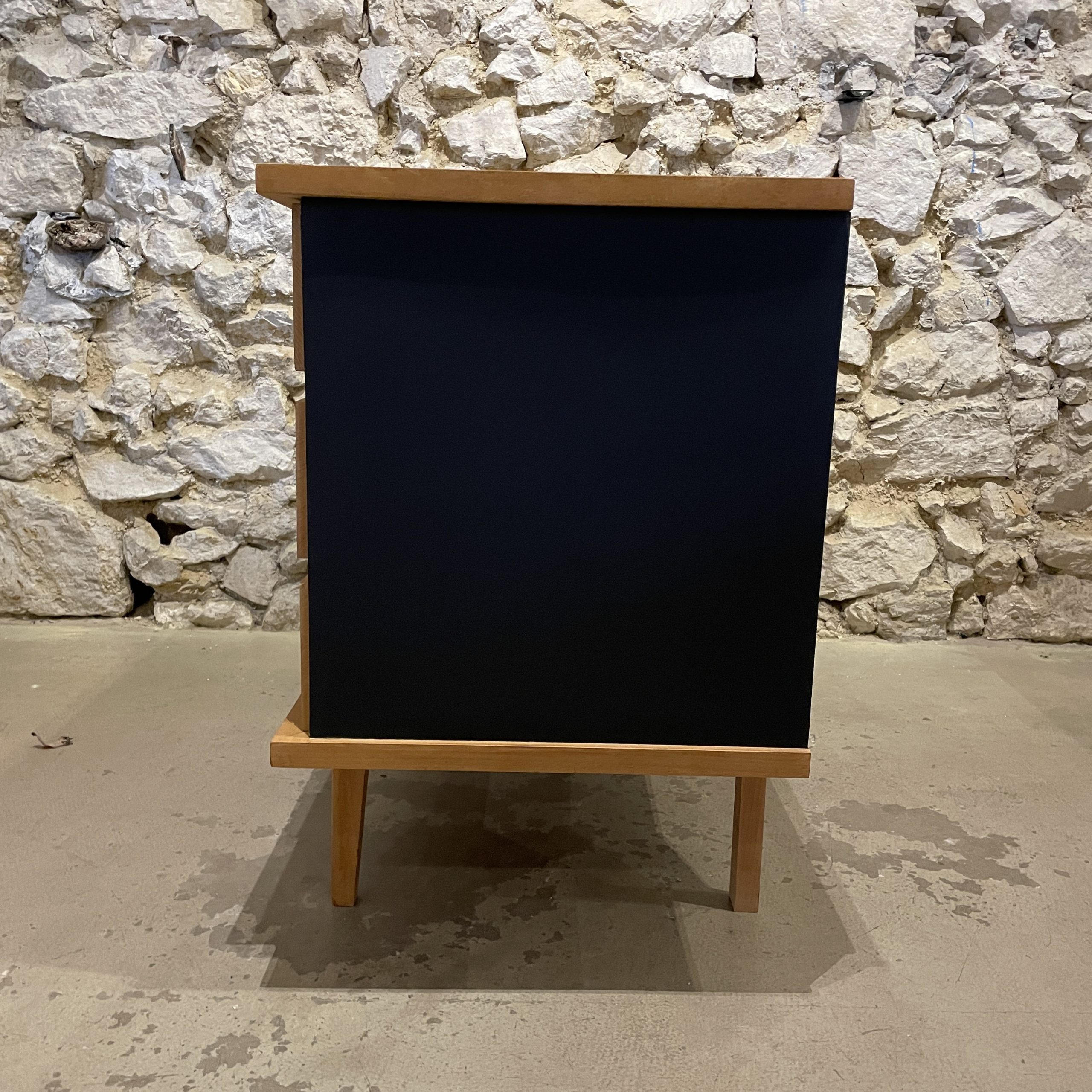 La mise en valeur du bois a été réalisée par l’application d’une finition protectrice claire, destinée à révéler la chaleur naturelle de la matière, tandis que certaines parties ont reçu une teinte sombre profonde afin de créer un contraste graphique contemporain fidèle à l’esprit scandinave. L’intervention s’est achevée par le remontage de l’ensemble, la vérification des alignements et la pose des poignées restaurées, venant parfaire l’esthétique du meuble rénové.