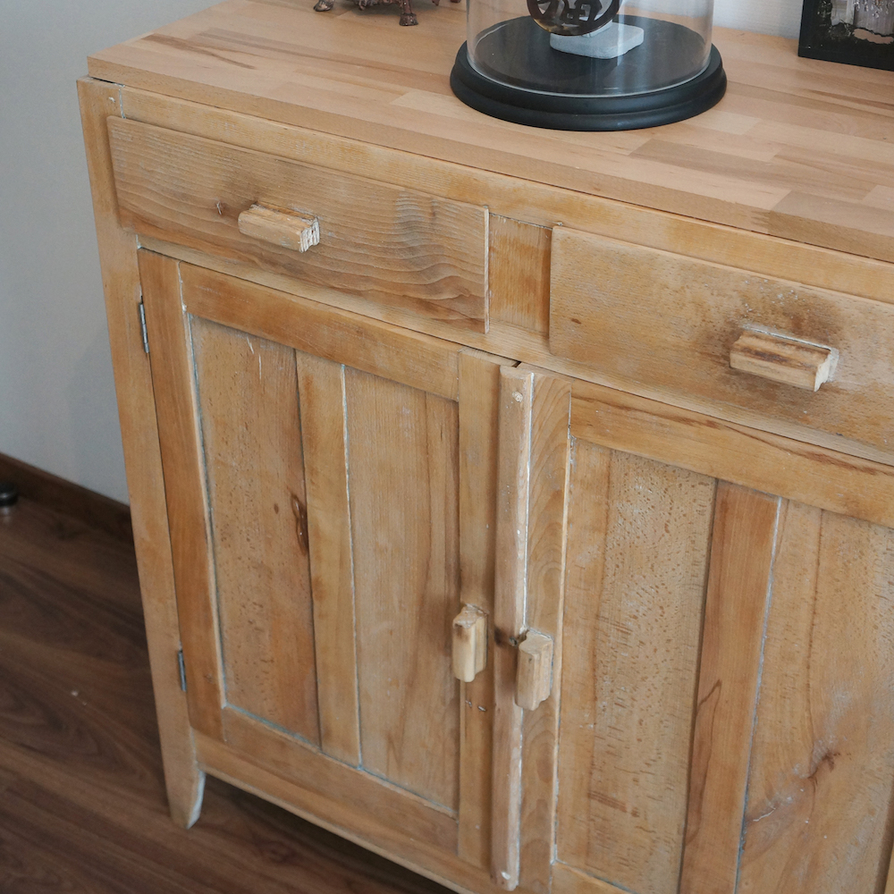 Pour ce petit buffet nous avons décapé 4 couches de peinture, poncé et verni l’ensemble. Le plateau supérieur a été changé car trop endommagé. Les charnières ont également été remplacées et l’étagère intérieure a été réparée.