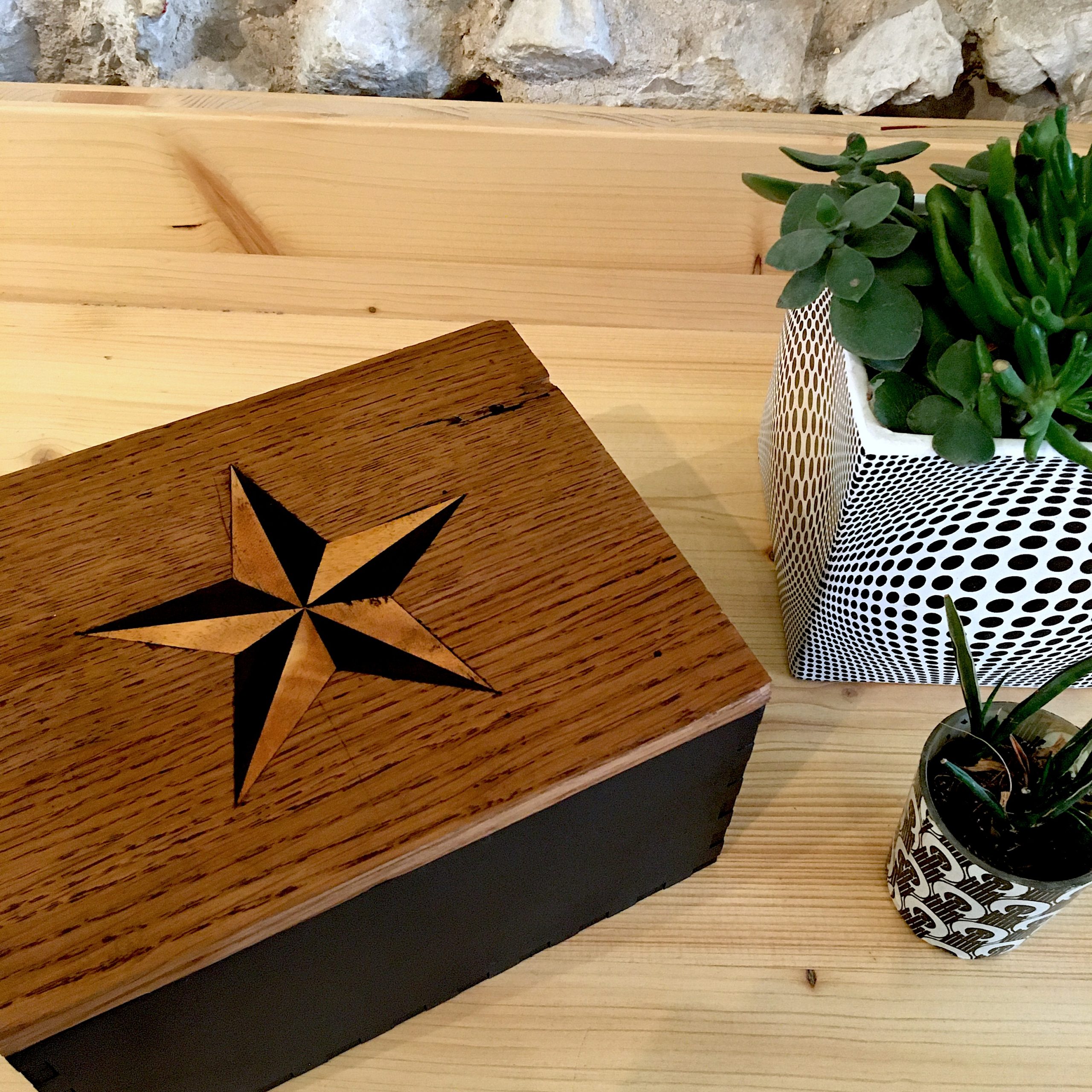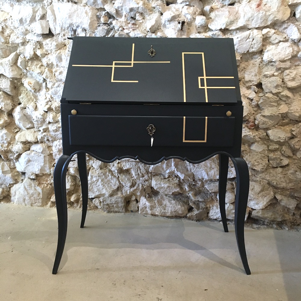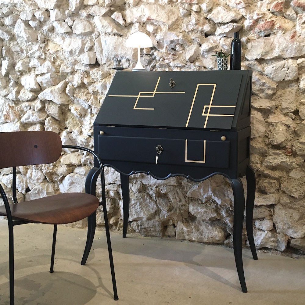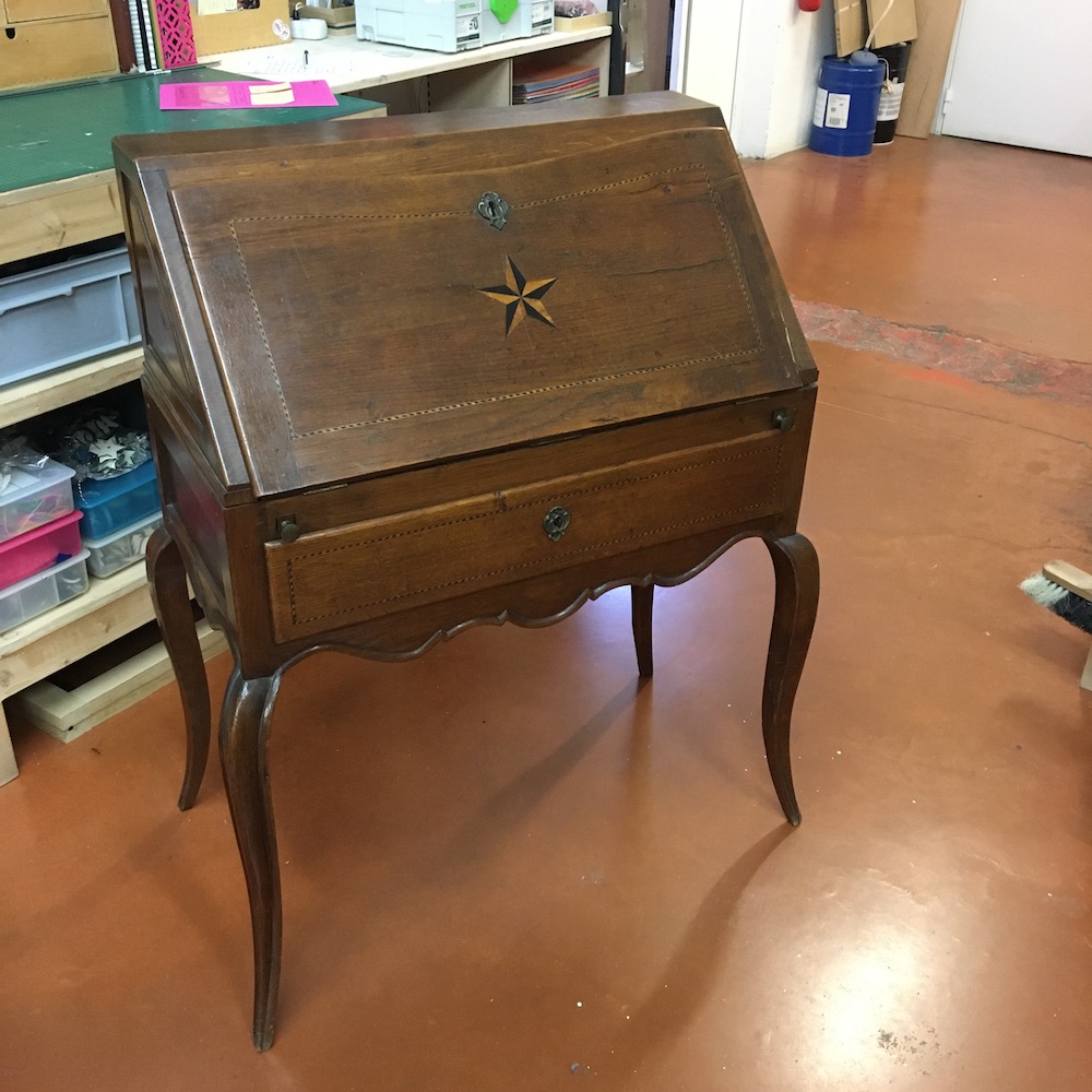 La partie du plateau marquetée en forme d’étoile a été récupérée pour fabriquer le couvercle d’une boîte assortie au secrétaire. Upcycling for ever !!!