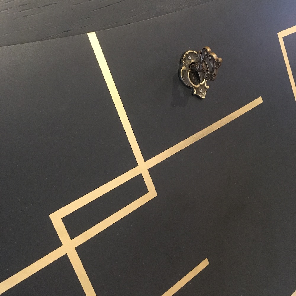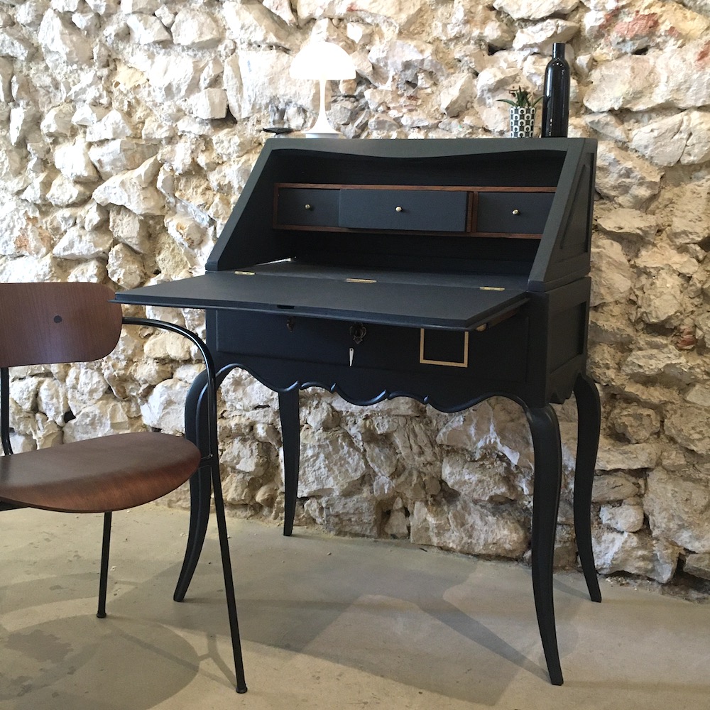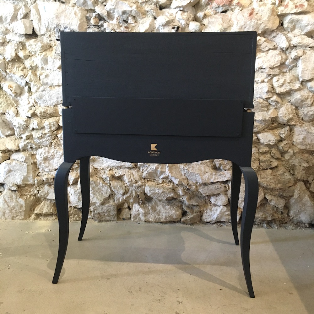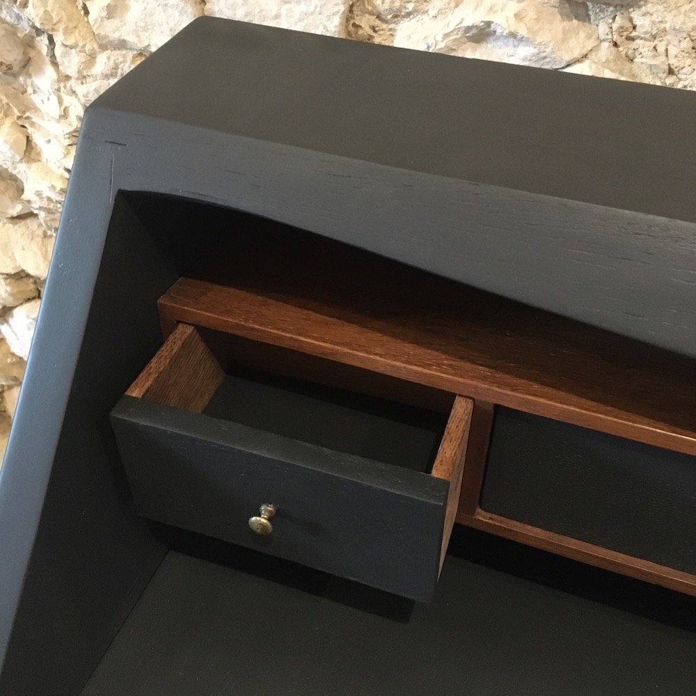 Le meuble a été démonté, poncé et nettoyé avant de passer aux étapes de peinture et de finition. Les éléments en laiton ont été légèrement rehaussés à la paille de fer et on a trouvé une nouvelle clé pour le plateau. L’étagère intérieure a été conservée en bois brut et simplement cirée pour raviver la couleur du bois.