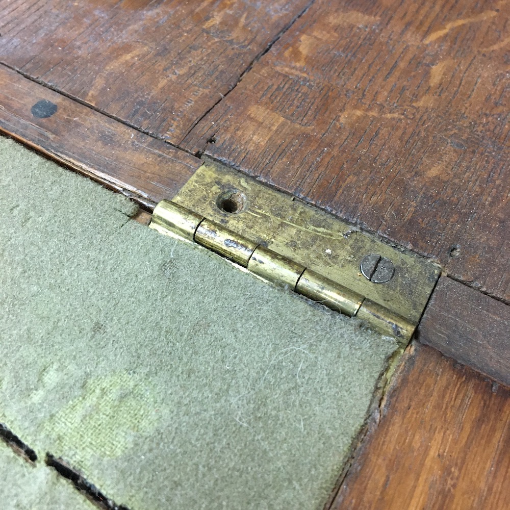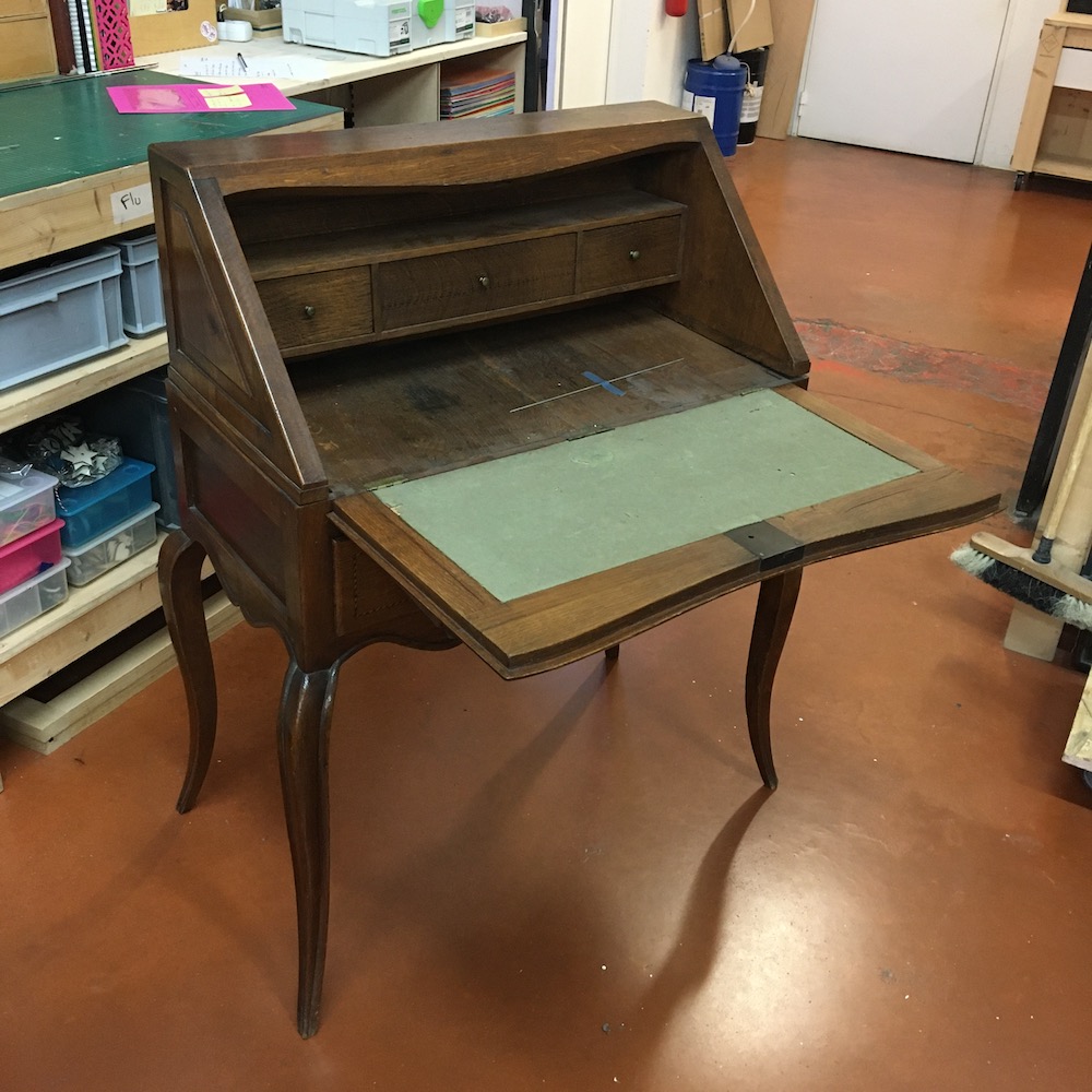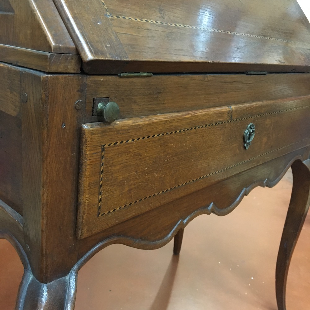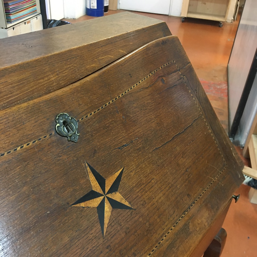 Le plateau est voilé et irrécupérable. Il manque une des deux clés, les éléments en laiton sont oxydés et pour finir, la couleur du vernis ne convient plus à la propriétaire du secrétaire.