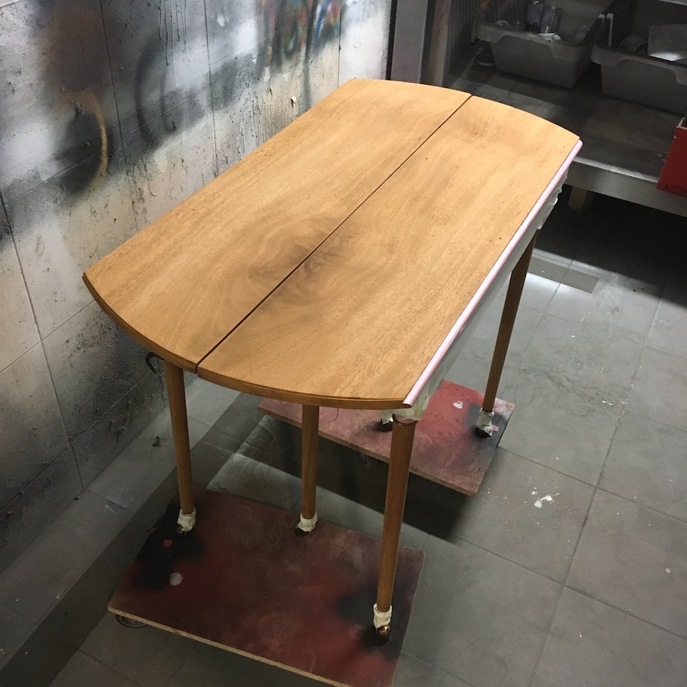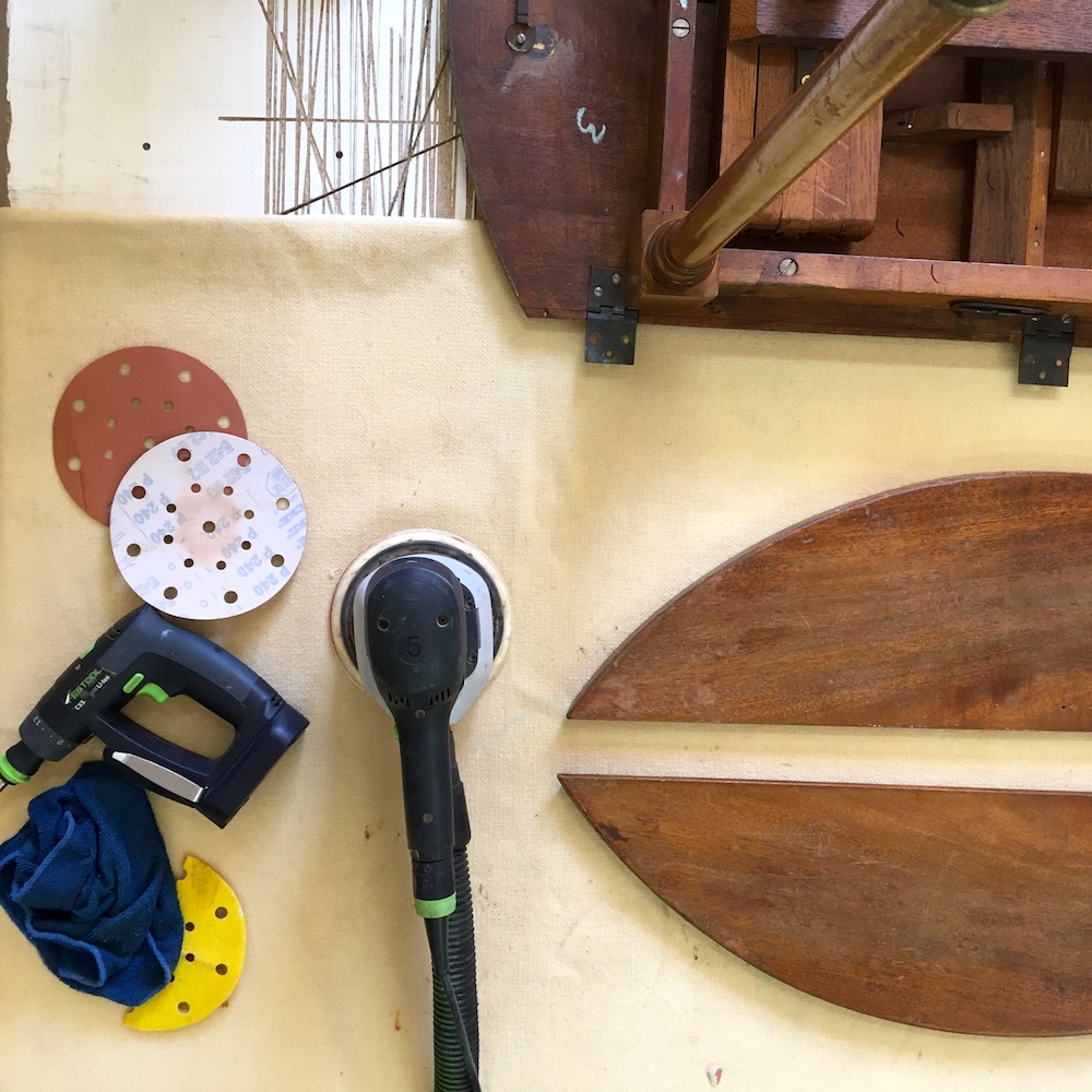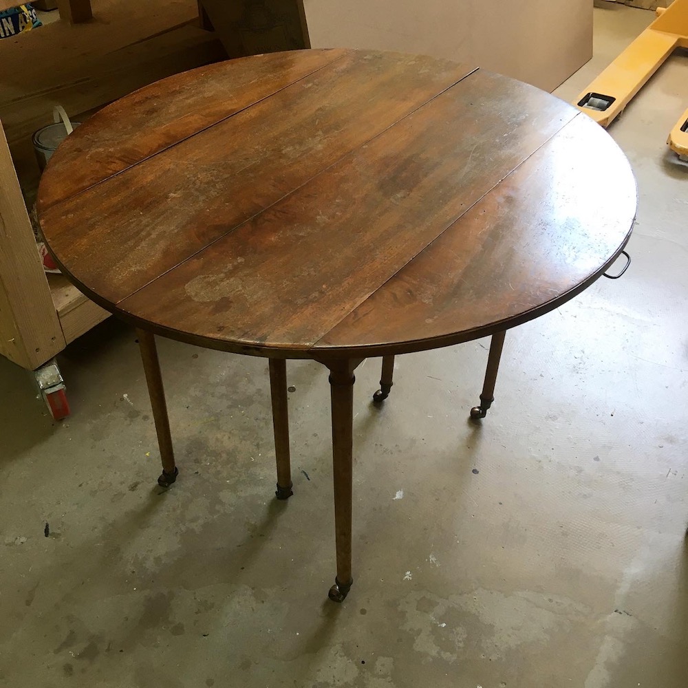 On démonte les volets et on retire les sabots en laiton. On passe ensuite au ponçage total de la table. Pour être au plus proche de la couleur d’origine, on applique un vernis teinté « rustique » en 3 couches. On nettoie les éléments en laiton avant de remonter le tout. On applique le même traitement sur les 4 rallonges.
