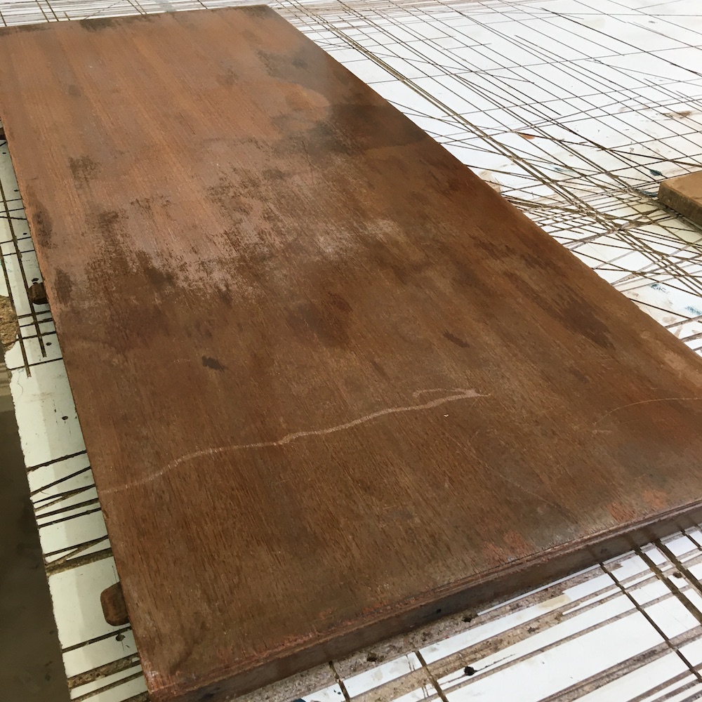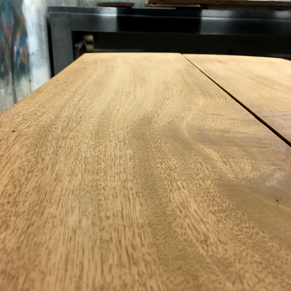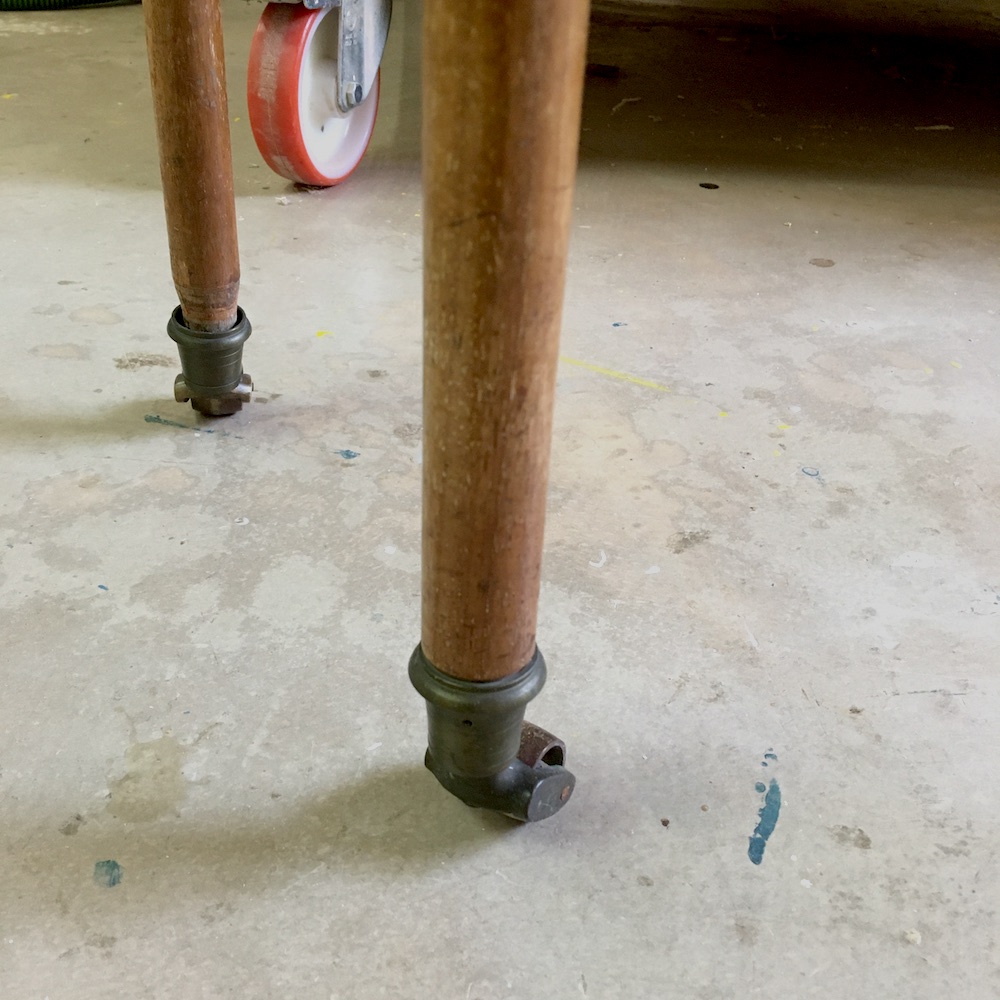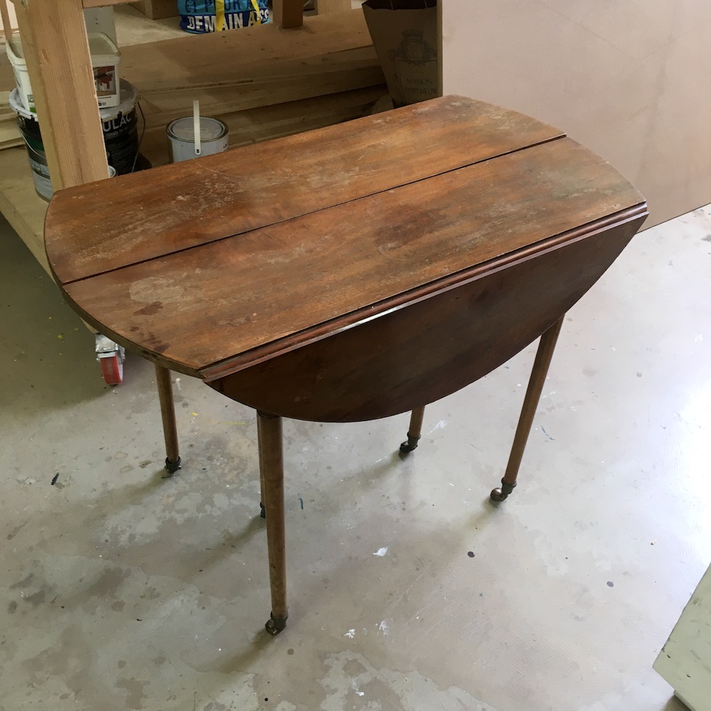 On démonte les volets et on retire les sabots en laiton. On passe ensuite au ponçage total de la table. Pour être au plus proche de la couleur d’origine, on applique un vernis teinté « rustique » en 3 couches. On nettoie les éléments en laiton avant de remonter le tout. On applique le même traitement sur les 4 rallonges.