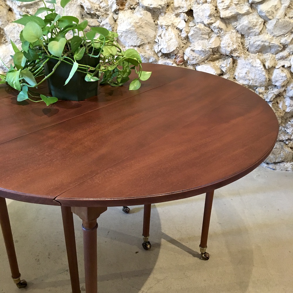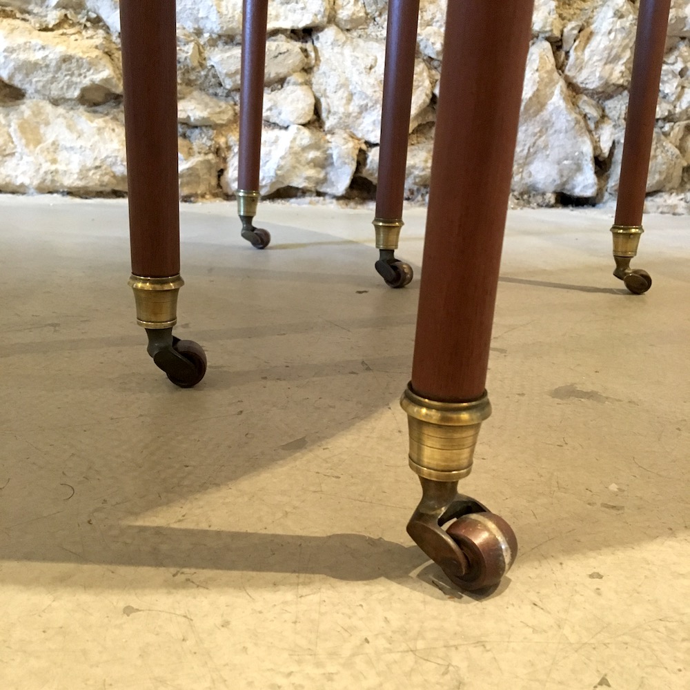 Une table de salon d’époque Louis XVI en placage acajou : 4 rallonges, 2 volets, 6 pieds fuselés terminés par des sabots en laiton montés sur des roulettes. Une belle table, assez rare, fine, légère mais très pratique.