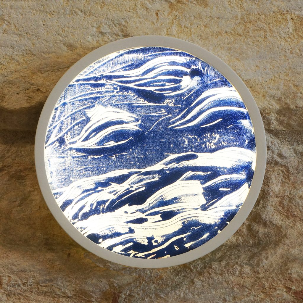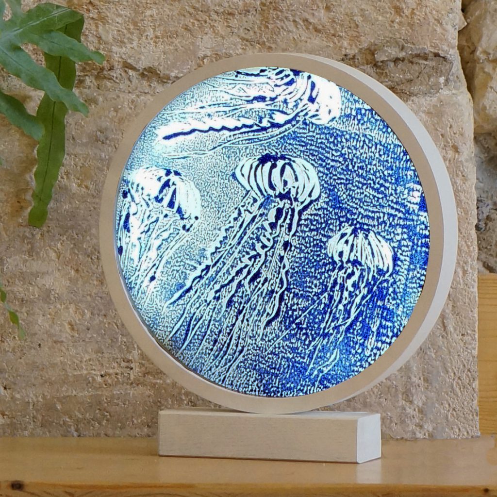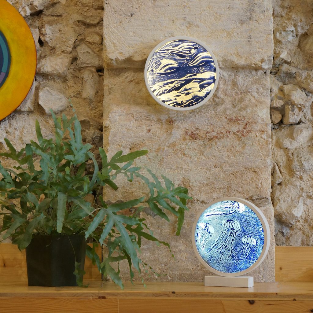 Designer une lampe pour permettre aux monotypes (procédé d’impression qui produit un tirage unique. Ici il s’agit de gouache appliquée sur un support en verre puis transféré sur papier) de Julie d’être mis en valeur grâce à la lumière en rétro-éclairage. Tester une version lampe de table et une autre murale.